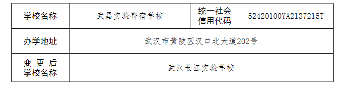 根据《中华人民共和国民办教育促进法》《中华人民共和国行政许可法》等法律法规的规定和国家有关规范民办义务教育发展的政策要求,武昌实验寄宿学校申请将学校名称变更为“武汉长江实验学校”。我局按行政审批程序,拟同意该学校名称变更申请,现予审批前公示。