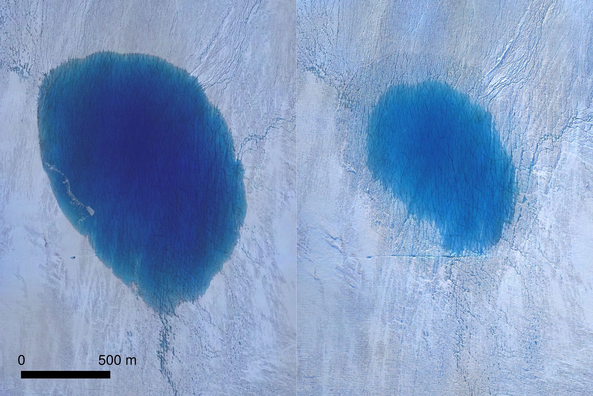 当地时间2019年12月2日,格陵兰岛冰盖上一个由融冰的水形成的湖泊在蓄满水之后开始快速破裂和排水,由于气候变化,这种现象越来越频繁。