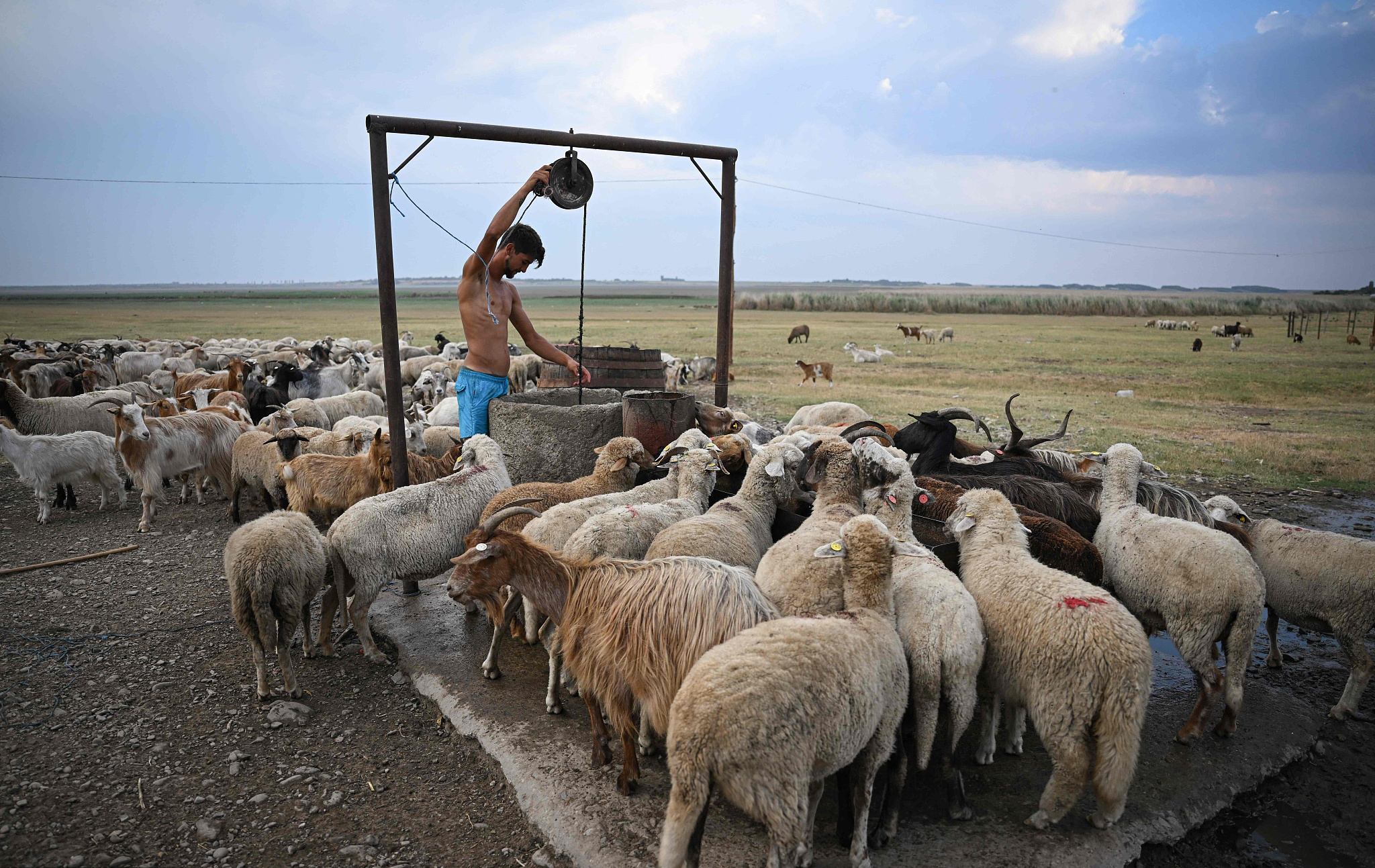 当地时间2022年7月28日,罗马尼亚斯洛博齐亚,牧羊人在阿玛拉湖床旁的井打水。