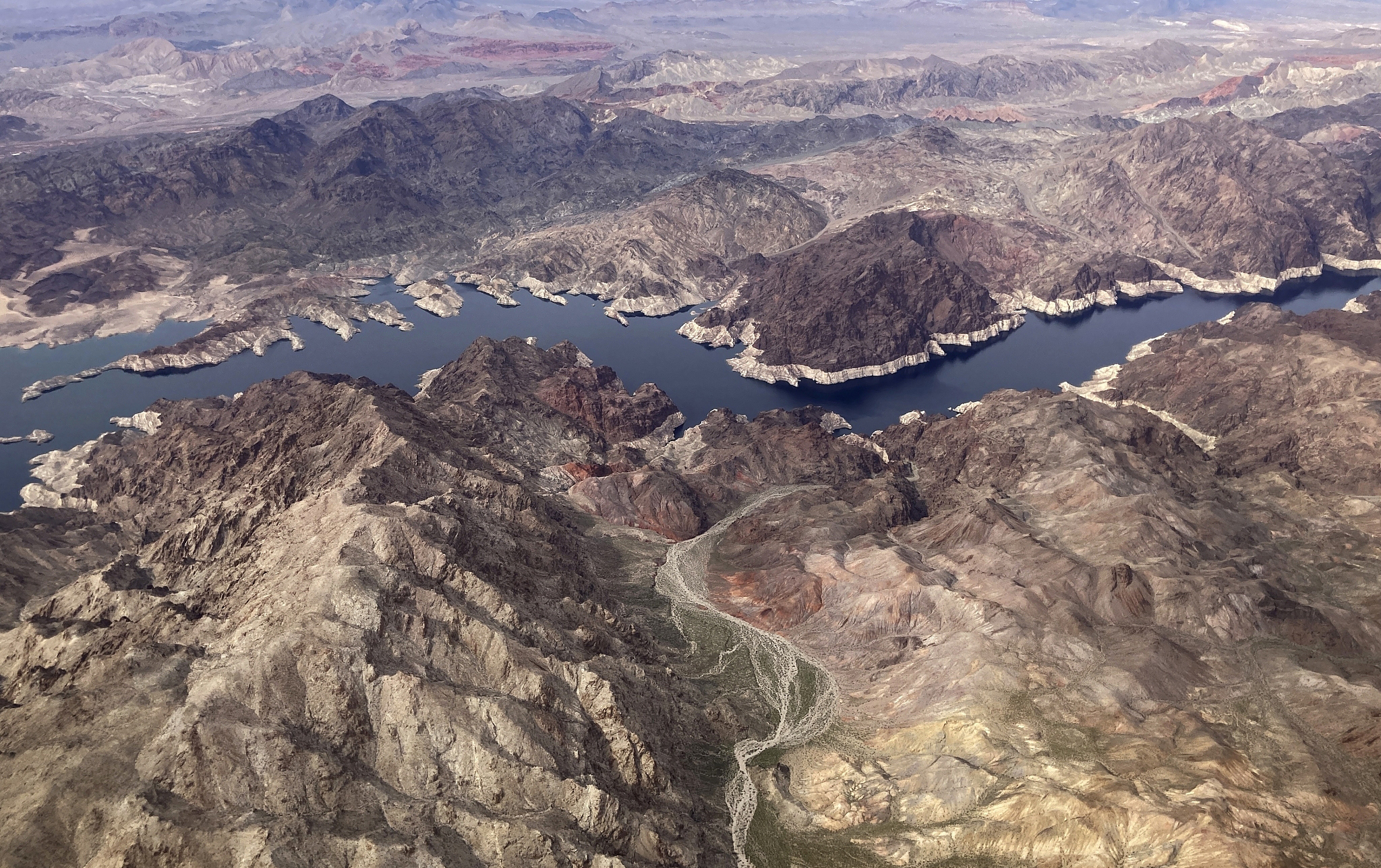 当地时间2023年4月16日,美国内华达州,棕色的科罗拉多河流经水位下降的米德湖。