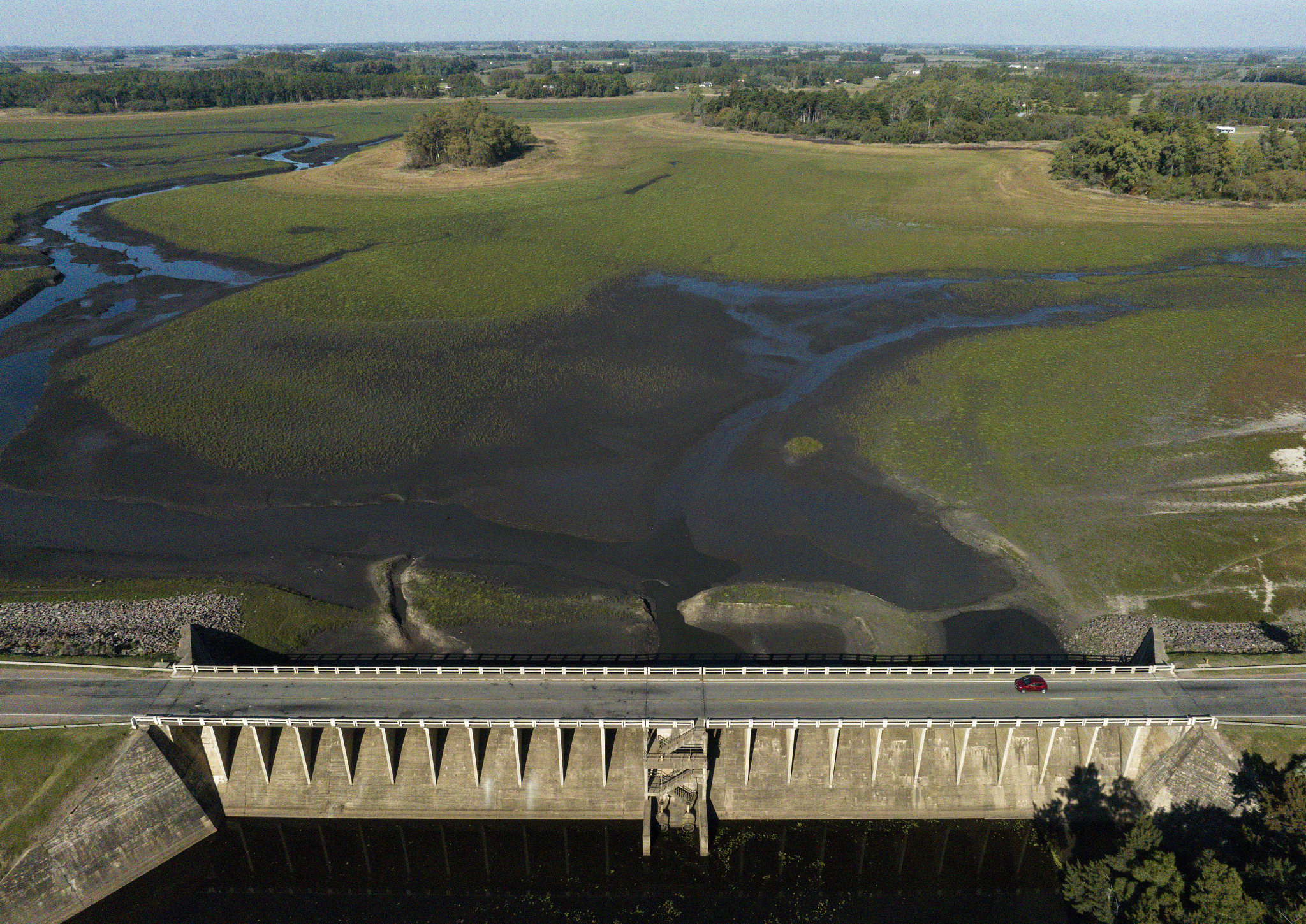 当地时间2023年5月15日,乌拉圭卡内洛内斯,CanelonGrande水库。乌拉圭持续的干旱导致蒙得维的亚和大都市区的饮用水严重盐碱化,附近水库的水位下降。