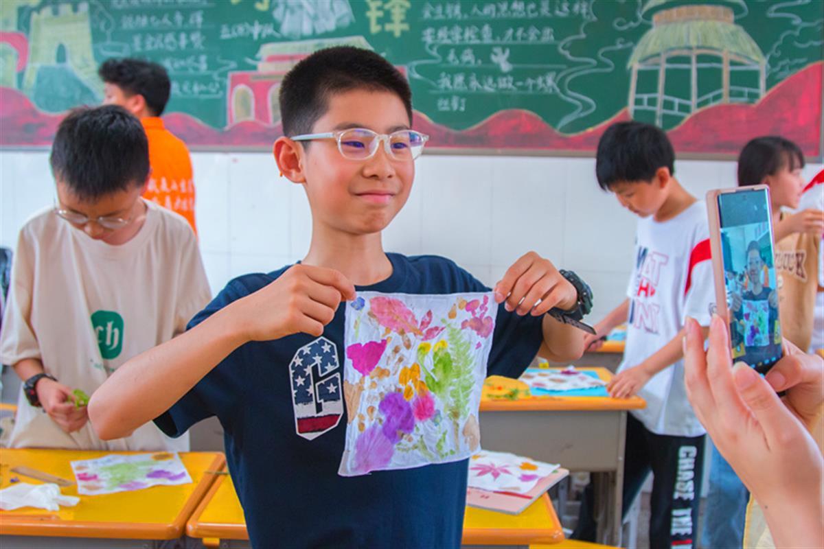 在活动现场,孩子们对本次职业技艺体验活动表现出了非常浓厚的兴趣,个个摩拳擦掌,跃跃欲试。在各技艺传授教师的示范下,孩子们有样学样,一步一划,神情专注地操练起来。“植物拓染第一步,记得务必把植物摆成你最喜欢的形状哦,还有色彩搭配,一定要漂亮”“孩子们,现在请拿起你的画笔,描绘出你心目中最酷的脸谱……”老师们认真地讲解着,孩子们模仿着,遇到难点,老师们一个一个手把手地教,学生志愿者们一会分发材料、一会传递工具,忙得不亦乐乎,技艺操作现场一片欢声笑语,不时,有“哇”的欢呼声传出,“老师,好神奇”“老师,我做好了”“老师,你看,漂不漂亮”,孩子们个个神采飞扬,高兴之情溢于言表。
