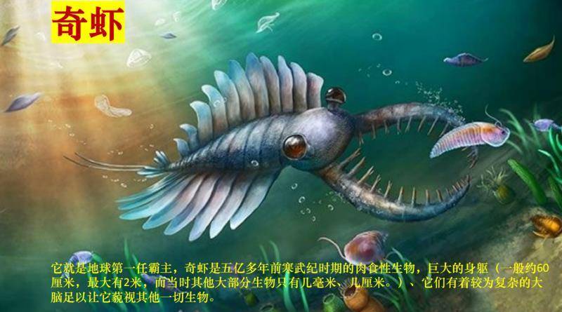 寒武纪是一个地质年代名称,是古生代第一个纪,距今约5.42亿年前—4.85亿年前,这是现代生物的开始阶段,是地球上现代生命开始出现、发展的时期,地球的第一任霸主奇虾诞生于这个时代,它畅游在5亿年前的海洋里,在世界多地的寒武纪层积岩里均发现它的化石,当时的生物普遍只有几毫米、几厘米,但它拥有相对巨大的身躯,一般约60长厘米,最大可达2米,它是一种扁平,具体节结构的海洋动物,可以使用身体两侧的柔软附肢在水中做波浪状移动,它们有着较为复杂的大脑,配合巨大的躯体足以让它藐视其他一切生物。