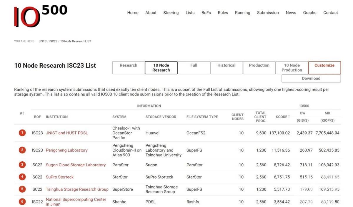 5月28日,极目新闻记者从华中科技大学获悉,在国际超算大会ISC2023上,华中科技大学并行数据存储实验室(HUST-PDSL)联合华为分布式存储和济南超级计算技术研究院研发的OceanFS2超算文件系统,以突破性技术获得IO500(超算存储500强)的“Research10节点榜单”总分第一、带宽性能第一和元数据性能第一,并将IO500世界记录提高15倍以上。这是华科大第二次获得该奖项,也是该校产学研结合的又一典型范例。
