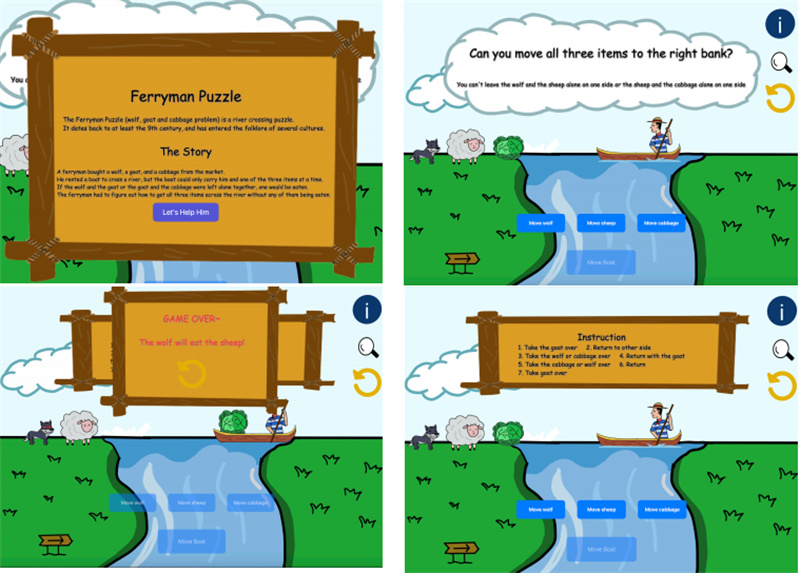 打开他设计的游戏,首先会看到关于游戏的介绍,随后进入界面,四个按钮分别是狼、羊、白菜以及船的移动按钮。此外,右上角第⼀个按钮是打开游戏介绍窗口。第⼆个按钮是指示按钮,点击之后,上端的云朵会变成显示答案步骤的木板,用户可以在答案的指示下完成游戏。第三个按钮是重置按钮,能让⽤户将游戏回到初始状态重新尝试。当⽤户在中途失败之后,甚⾄能看到羊流口水或者狼流口水,羊害怕的样⼦。