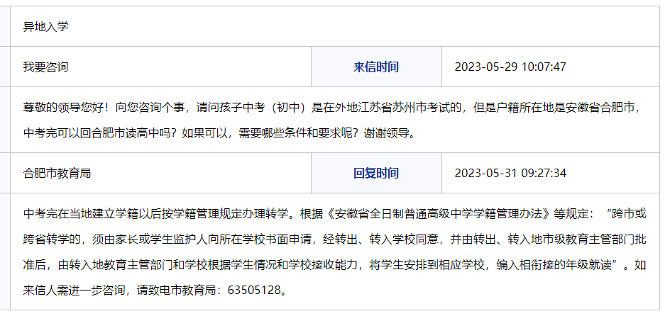 大皖新闻讯 近日,有网友在合肥12345热线咨询异地入学事宜。这位网友称,其孩子中考(初中)是在外地江苏省苏州市考试的,但是户籍所在地是安徽省合肥市,中考完可以回合肥市读高中吗?如果可以,需要哪些条件和要求呢?