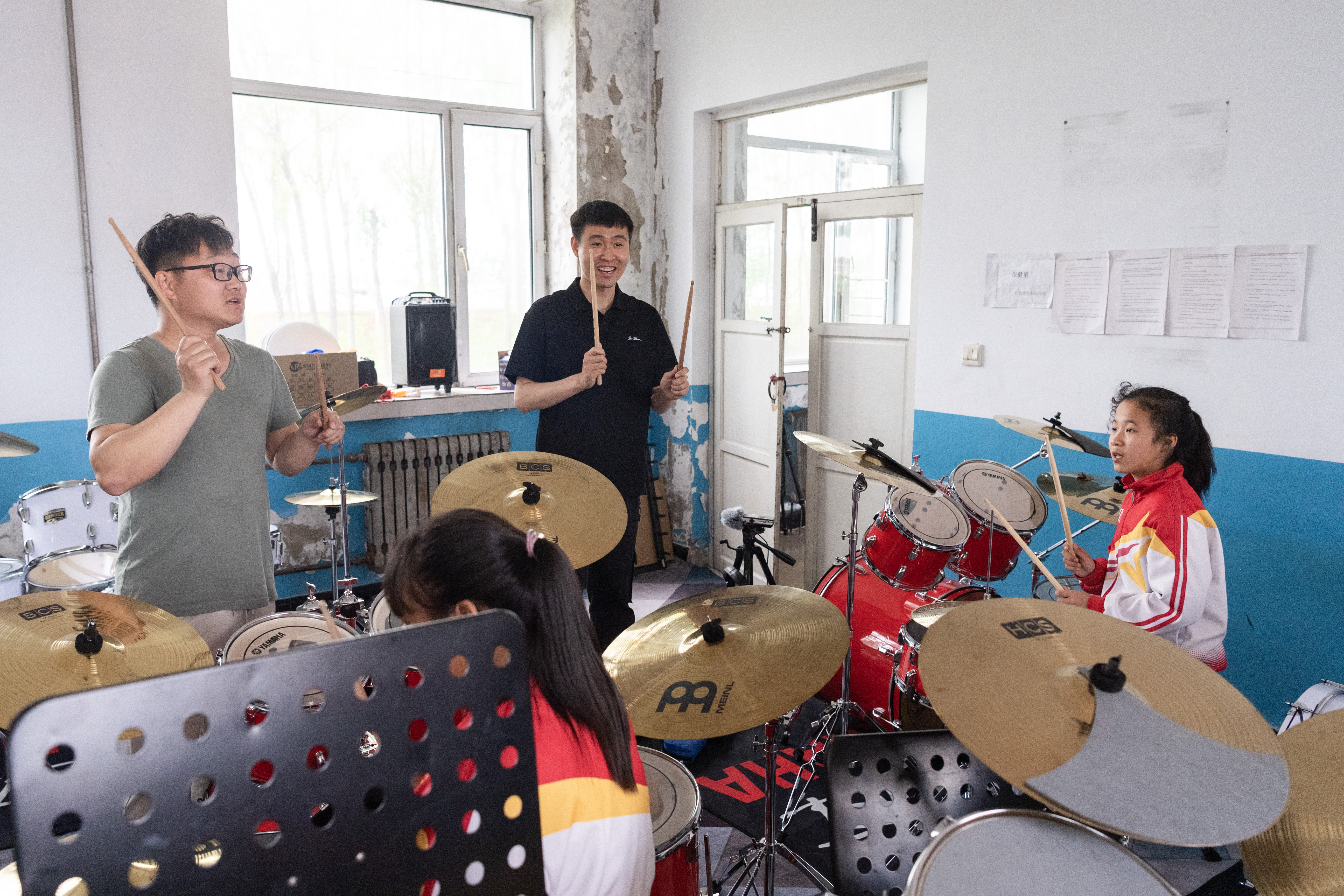 “张老师教我学会了架子鼓和口风琴,我得多练习,以后争取当一名歌唱家。”11岁的冯雨薇在老师指导下打出有节奏的鼓点。