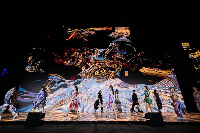 在时装秀环节,中国美术学院设计艺术学院服装与服饰设计专业的46名同学80余件作品围绕艺术、哲学、科技领域的前沿探索,关注生存危机、文化异化、社会关怀、身体语言、情感障碍、未来试验场等话题,以开放式的观念,多维的表现形式展开设计:虚拟与现实交互,实验性的材料探索、针织创意肌理、3D打印等技术都成为了设计师们探求的路径,由线索、记录、实验、沉淀再到创意的最终实现,展现了每位学生对生活世界的真实追问与未来世界的想象。