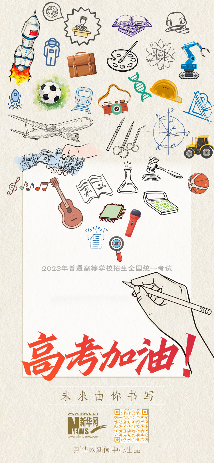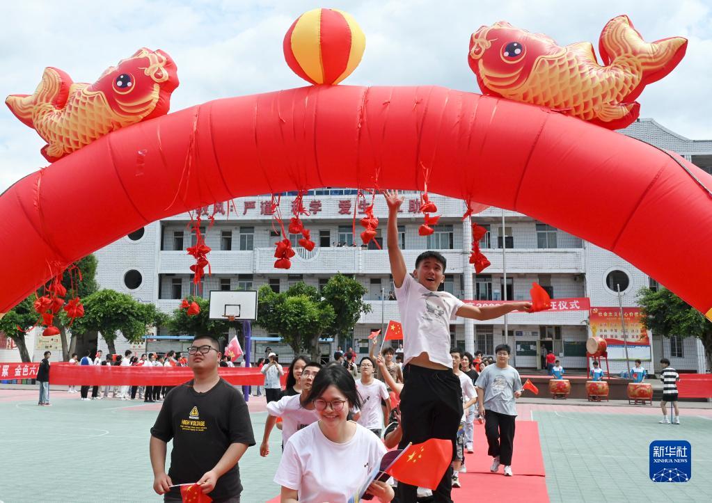 6月5日,四川省内江市第十三中学的高三学生冲过“得胜门”,希望能取得好成绩。新华社发(兰自涛摄)