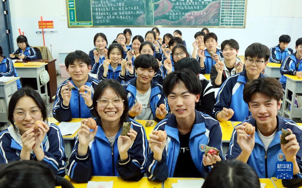 6月5日,河南省洛阳市汝阳县第二高级中学学生收到学校送上的写有高考祝福语的鸡蛋和粽子。新华社发(康红军摄)