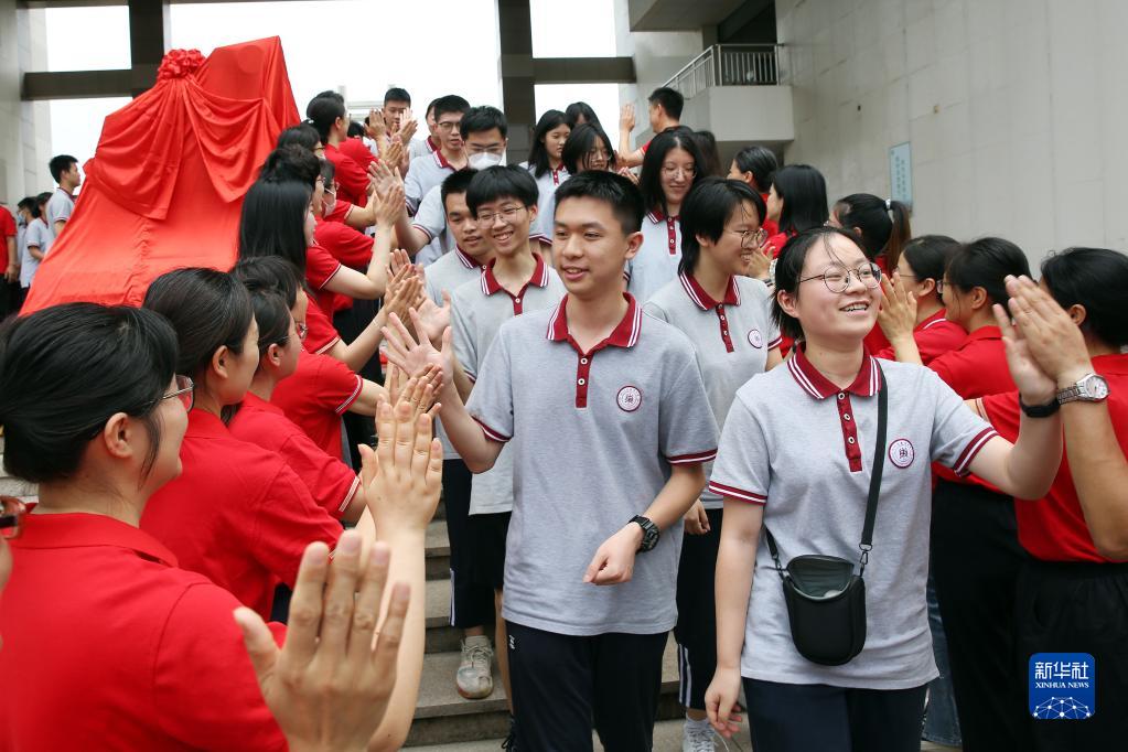 6月5日,浙江省东阳中学老师们和高三学生击掌,为他们加油鼓劲。新华社发(胡扬辉摄)
