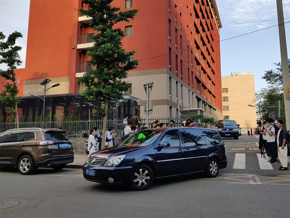运送试卷的车驶离北京海淀区教育招生和考试中心。