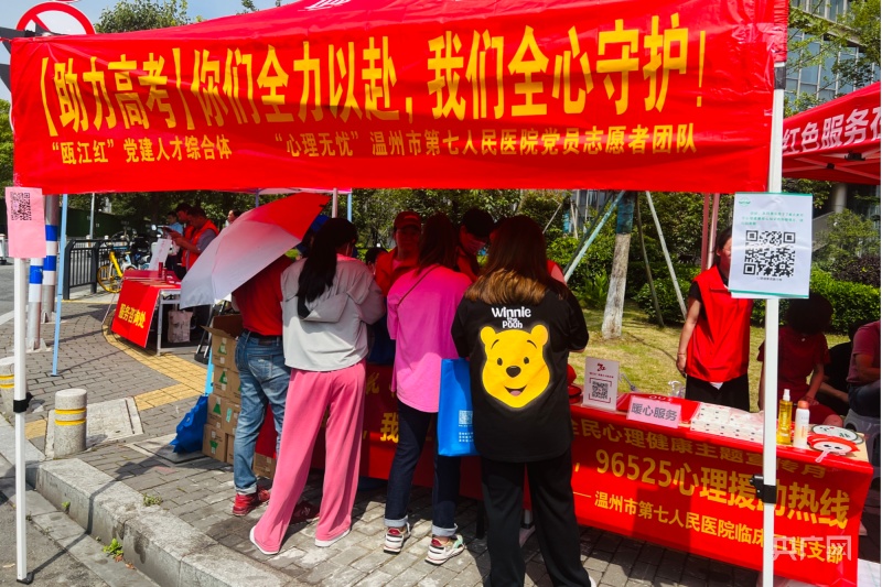 温州市第七人民医院“心理无忧”党员志愿服务队在高考考点,开展助力高考心理服务活动。活动现场安排咨询医生,解答考生常见心理状态的相关问题,并积极向家长、学生、老师宣传推广温州市24小时心理援助热线96525,让温州的心理服务触手可及。