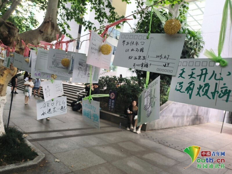 “愿我们在自己喜欢的道路上勇往直前!”“明年此日青云去,却笑人间举子忙。”不论是对自己的期许,还是对校园的热爱,毕业学子或将祝福写在明信片和书签上,或亲手制作一个简约风车,在工作人员的帮助下悬挂上树和天桥,将自己的心声传遍校园的每个角落。当挂上自己的卡片后,毕业生陈元涛略带伤感地表示:“拿起笔的瞬间,我心中万般思绪飘过,但最终却只落下一句‘毕业快乐’,虽然简单,但却涵盖了我所有的情感。”这一行行寄语,成为了他们毕业时光中最靓丽的风景线之一。