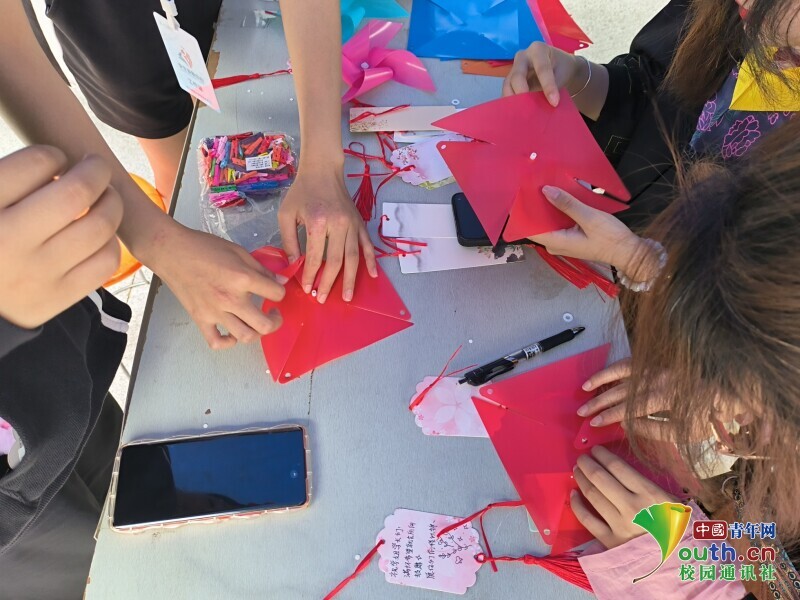 图为工作人员向毕业学生示范风车做法。中国青年网通讯员陈家瑶摄