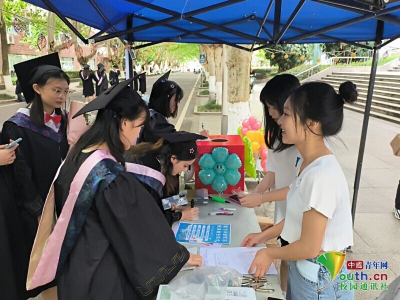 经过折叠、交叉,一声按钮扣响后,两架红色的风车完美制成。毕业生唐玢珩和于梦雪激动地在风车里写下自己的名字,并赞叹道:“非常感谢我的学校和学弟学妹们,虽然它们制作步骤简单,但在我们心里是最棒的风车!”手工diy的活动形式有新意,更有心意。在接受采访时,谭茂琴也表达了对母校的不舍与感激:“再来一次,我还是会选择川农!”谈及学校里印象深刻的事,她坦言自己会因学校在每个节日准备的暖心礼物而感动,也因老师们的谆谆教诲而感激。