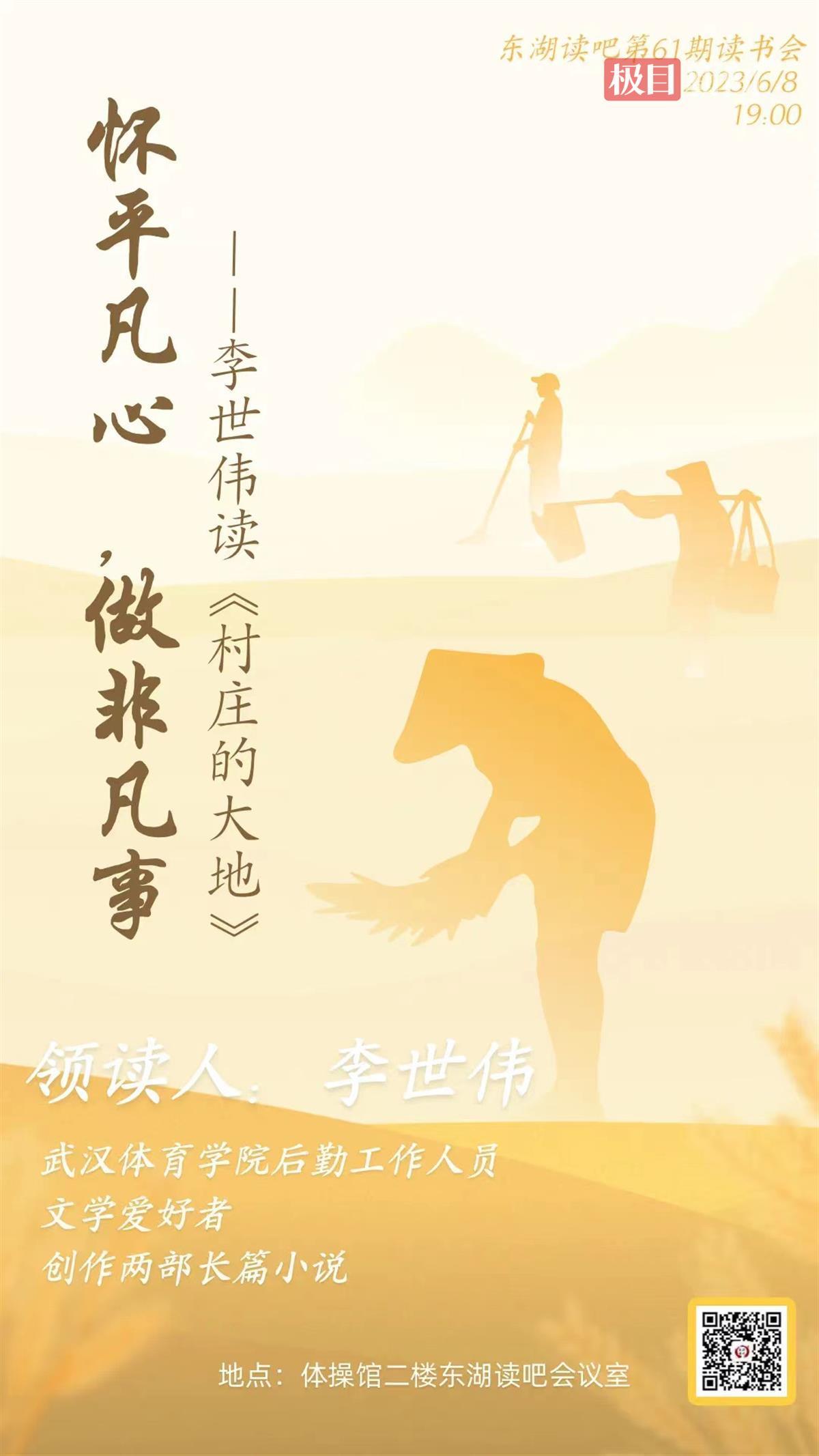 6月8日晚,为了将“读书、实践、创新”的理念分享给广大学子,武汉体育学院邀请到“网红保安作家”李世伟在该校体操馆二楼东湖读吧会议室现场,分享有关《村庄的大地》创作过程中的点点滴滴。