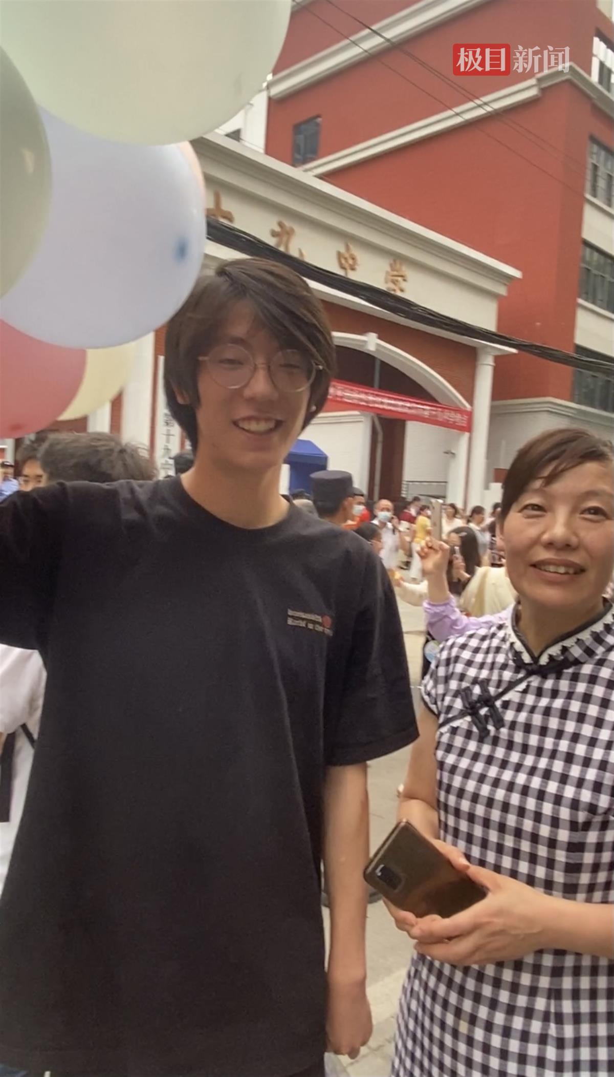 6月9日,高考最后一门生物考试结束后,在武汉市第十九中学门口一家长手持气球迎接孩子。