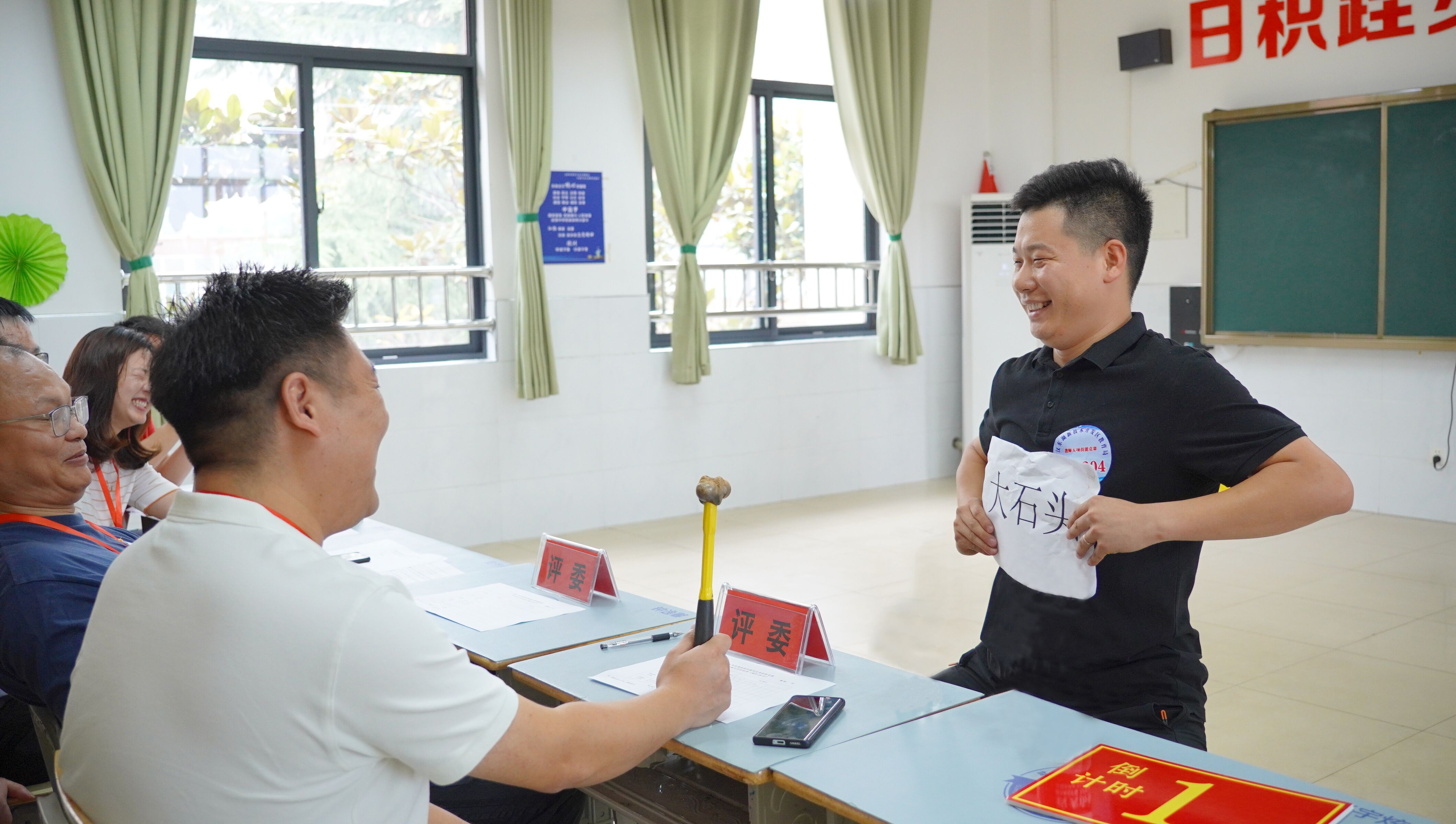 对周鑫的答案“所谓中学生‘难教’,取决于老师如何看待学生,老师应注重非智力因素对学生学习的影响,要多共情、理解学生,也应注重家校社协同和以集体的力量引导其共同成长”和“学科融合应以提升学生思维品质为指向,文理科并非泾渭分明,都可以做到提升学生的逻辑思维能力、形象思维能力和科学思维能力”,评委们很满意。竞赛现场负责人说:“我们可不仅仅是在考老师。这些题目都是原创的,与国家教育政策和当前当地教育热点相关,老师能答好,学校日常就肯定在做研究、抓落实。教师五项技能竞赛不仅在引导教师创新教学育人方式,也在鼓励学校顺应时代发展积极进行教育变革。”