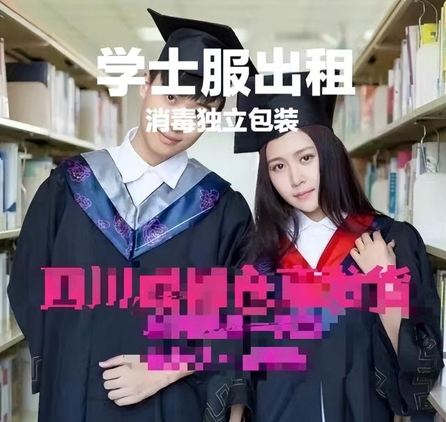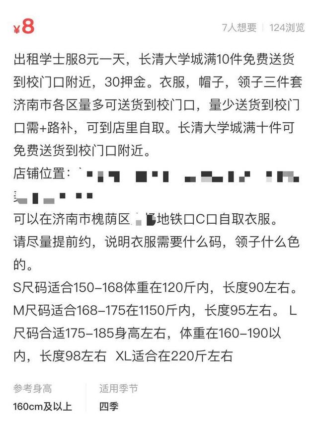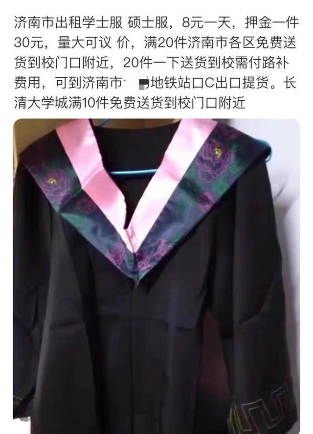 “全新学士服、硕士服,量大可议价。可按小时、半天、全天租赁。备有旗袍、JK裙等多种样式,满20件免运费,欢迎咨询。” 在济南高校内学士服的租赁广告随处可见。