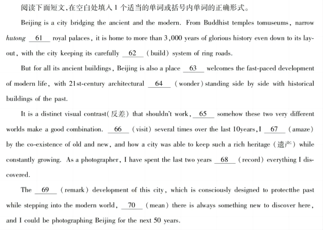 原来,今年全国乙卷上的语法填空题,正出自ChinaDaily的文章AHarmonyofOldandNew。这篇文章介绍了传统与现代碰撞下的北京,展现了这座城市别样的魅力。