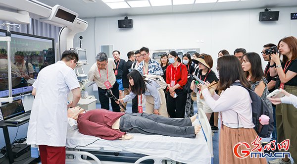 在医学模拟中心,“活着的模拟人”吸引记者们目光。(主办方供图)