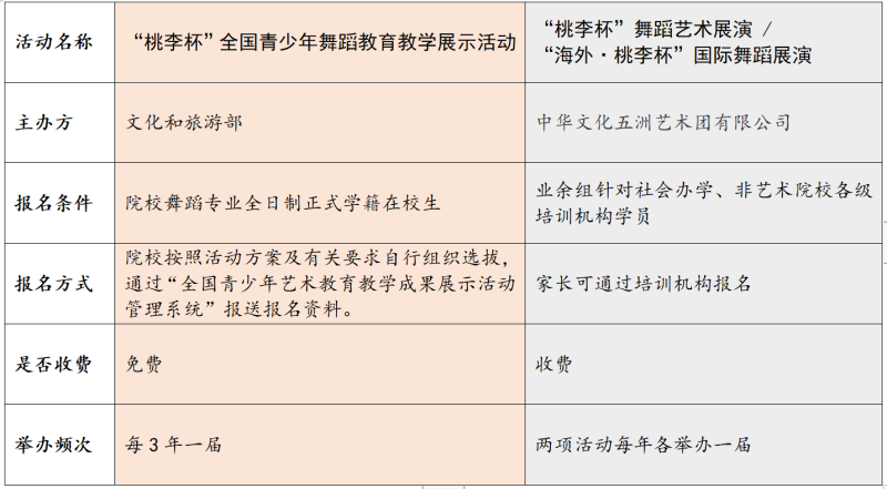 文旅部主办的“桃李杯”和民间商业化“桃李杯”的部分不同之处。新京报制图