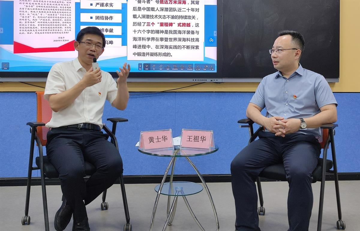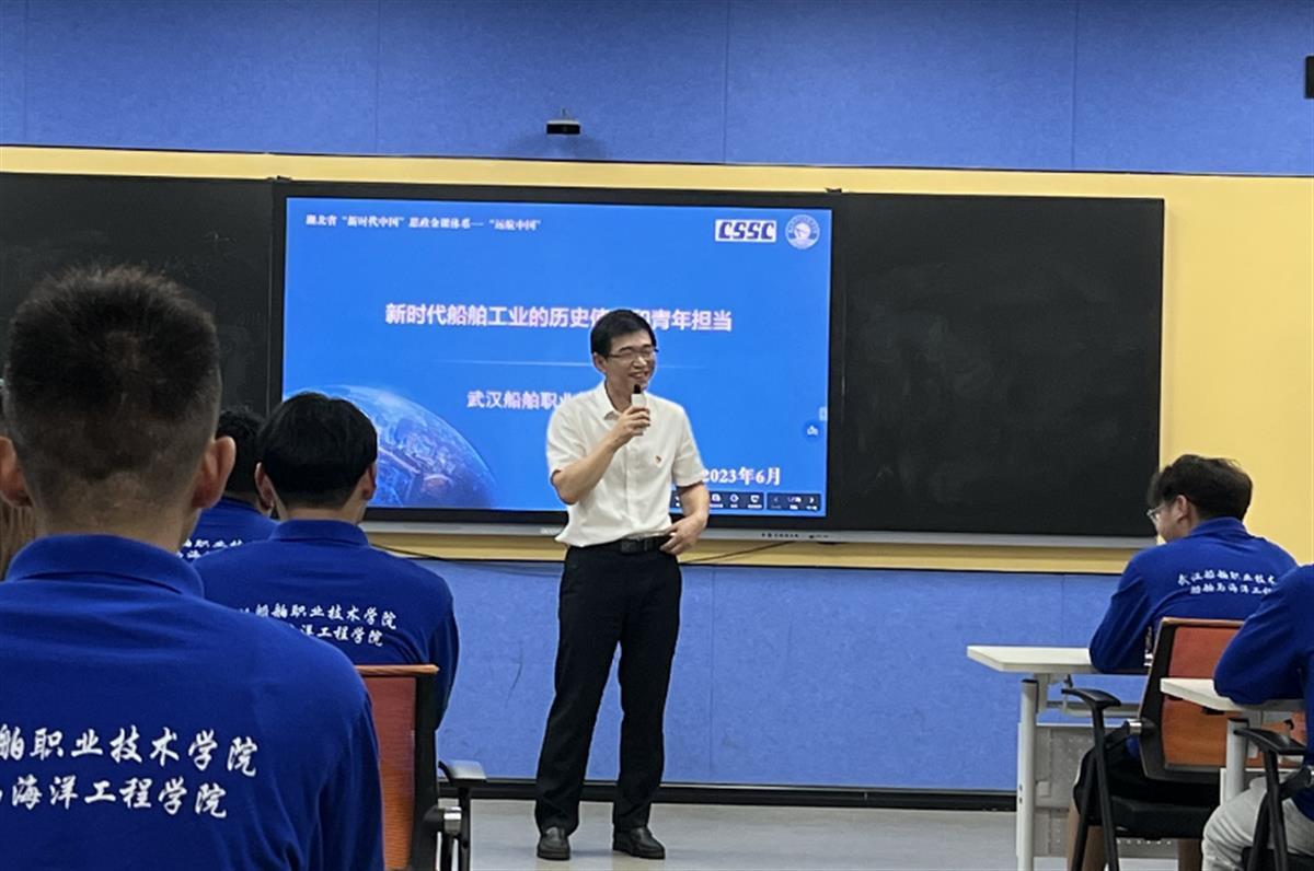 与传统思政课堂教学不同的是,此次思政课迎来了两位主讲人,一位是武汉船舶职业技术学院党委书记黄士华,另一位是武汉第二船舶设计研究所副所长、学院船舶智能制造专业产业教授王祖华。两人的互动漫谈教学模式,让现场学子们耳目一新,也更深入地了解到“新时代船舶工业的历史使命和青年担当”。