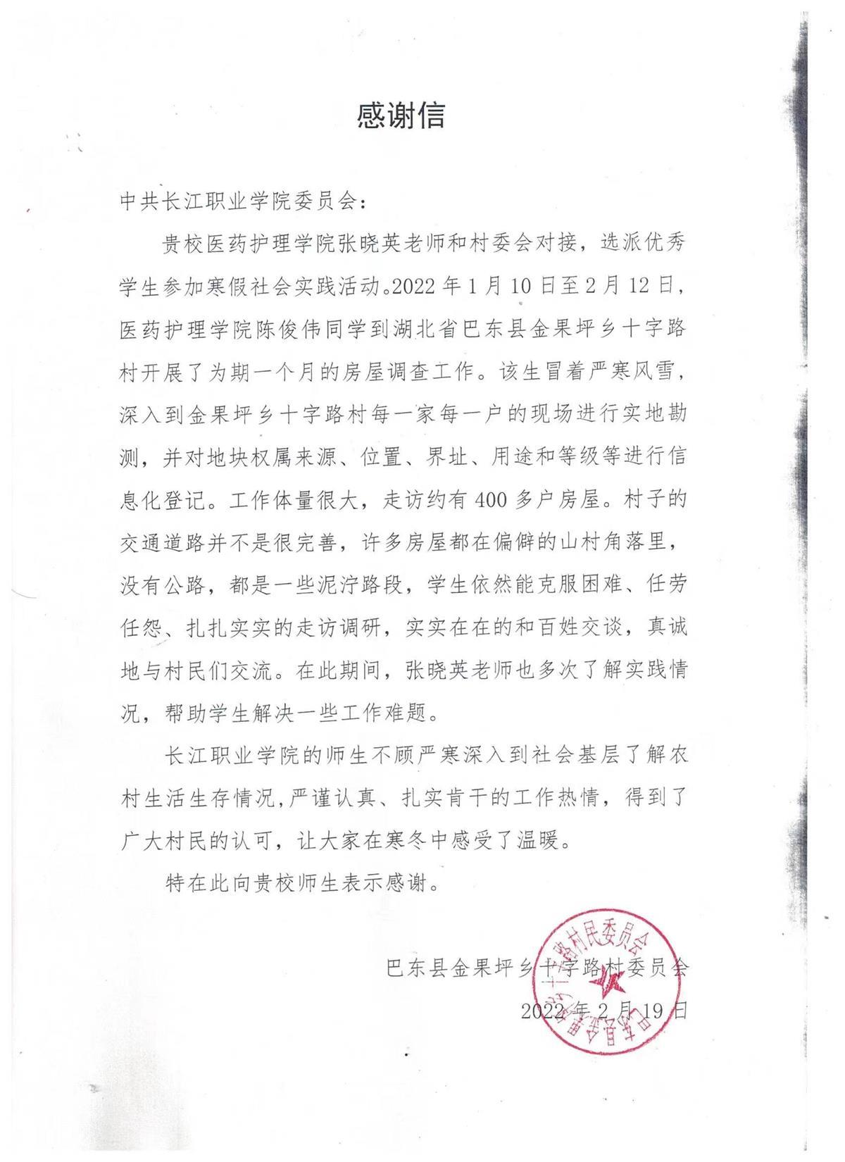 “寒冬腊月、山路泥泞,感觉人要废了。”陈俊伟说,那段日子,张老师一直在电话那头耐心鼓励、指导他,教会他真诚地与村民们交流。最终陈俊伟一步一个脚印完成了400多户房屋的走访工作。陈俊伟扎实肯干的工作态度,得到了广大村民的认可,寒假结束,村委会特意向学校寄来感谢信,表达对陈俊伟同学和指导老师张晓英的感谢。
