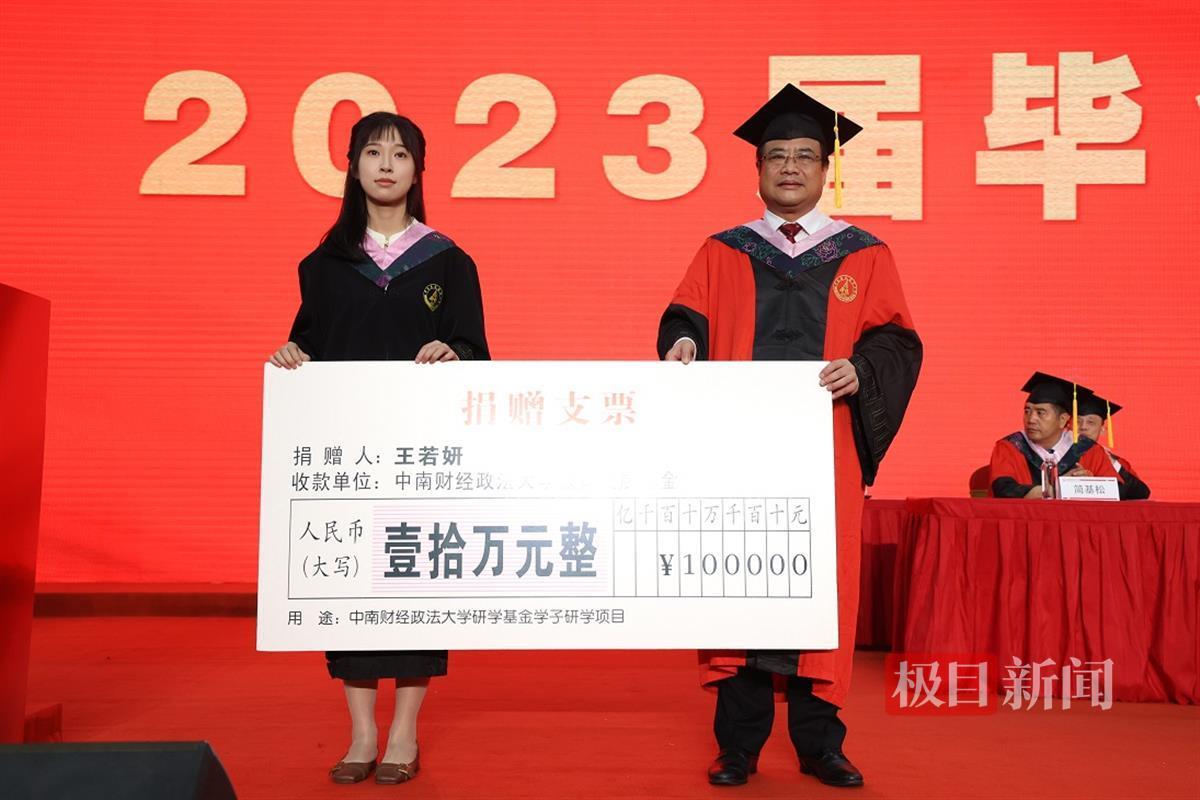 中南财经政法大学党委书记侯振发代表学校接受王若妍同学的捐赠,并向她颁发捐赠证书,这些款项将汇入“中南财经政法大学研学基金”。