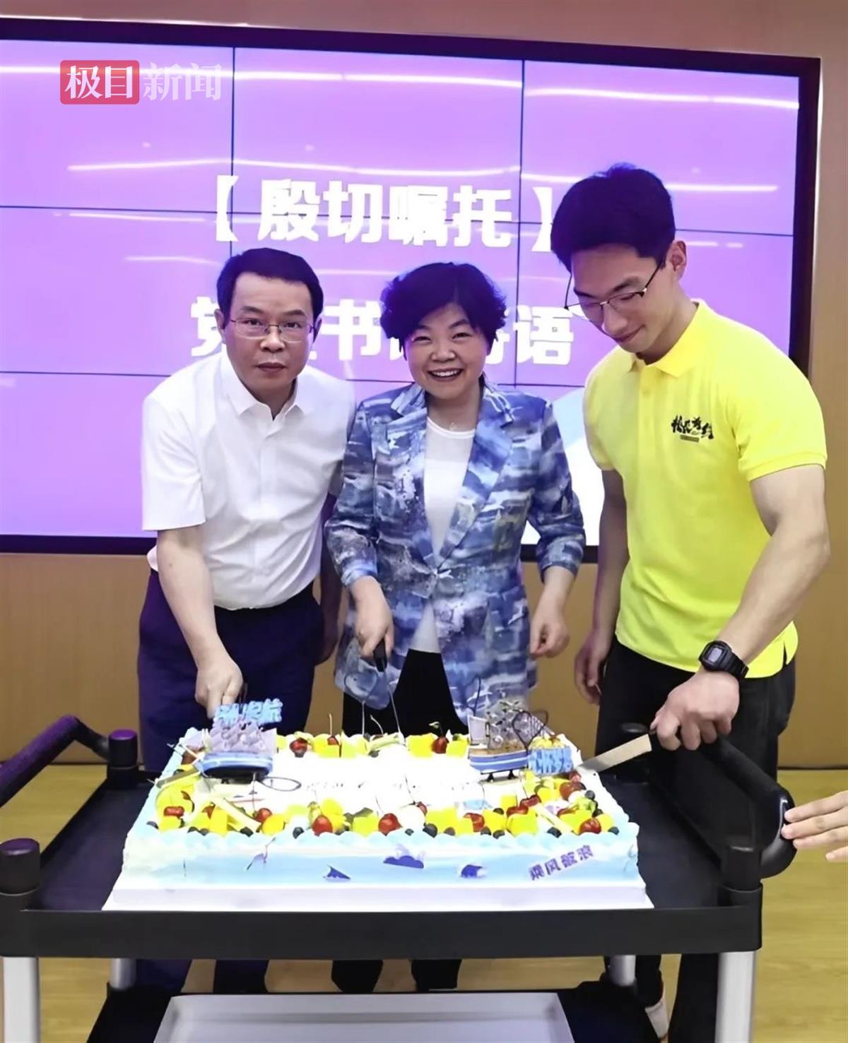 杨鲜兰(中)、郑军(左)提议与毕业生代表一同切开大蛋糕