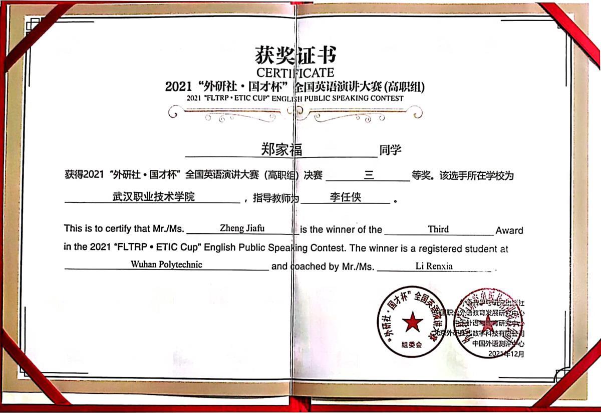 “人生没有终点,每个阶段都是新的起点。”郑家福考上高职院校后,并没有放弃自己想上升本科的想法。“我离本科只差九分,我认为我是有能力上本科的。”为了进一步提升自己的学历,郑家福在高职读书的三年期间,认真学习,数次参加英语口语比赛,积极提升自己的能力。校园里处处都留下他奋斗的身影,一张张证书也见证了自己的成长。