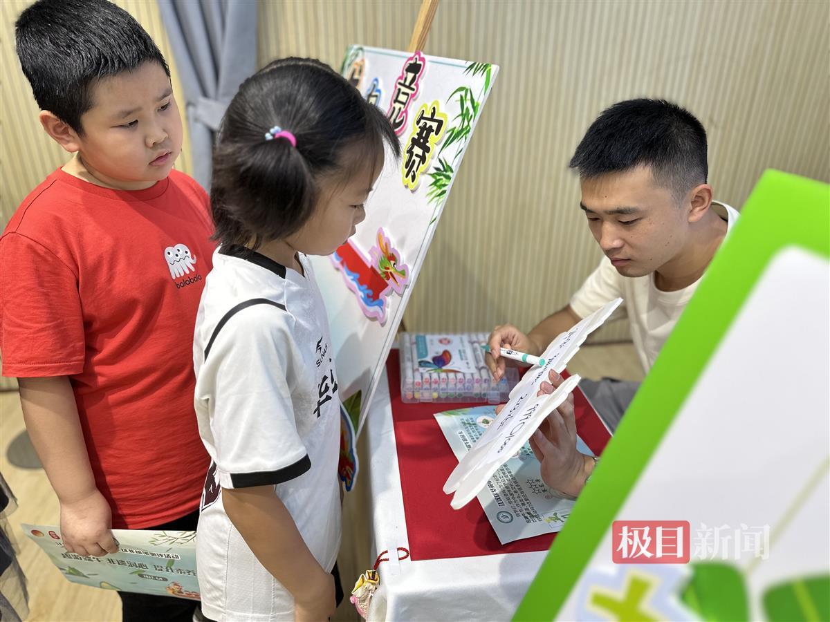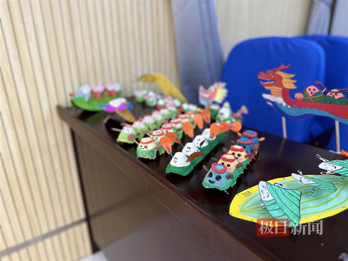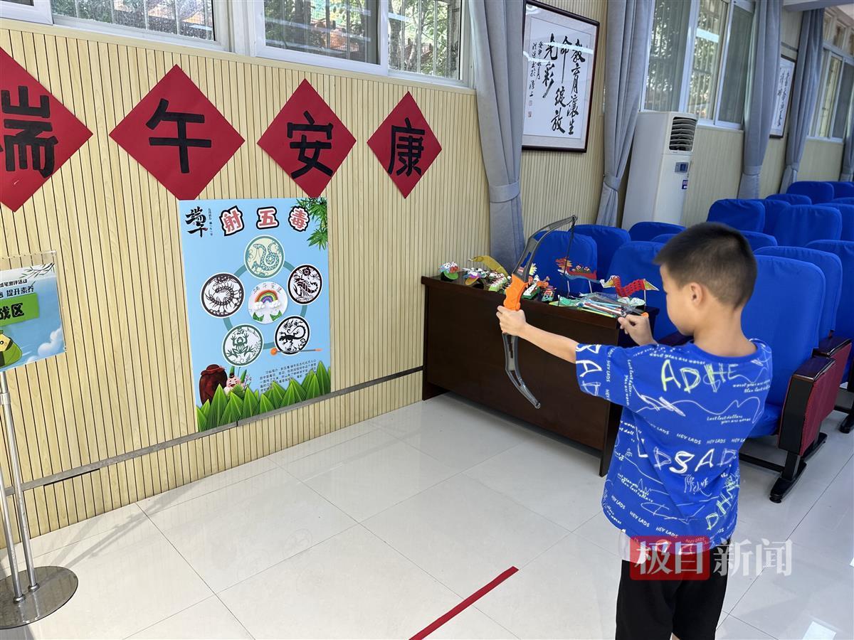 除了参加测评挑战,学生们还在民俗挑战区,通过五种虫子的图案,进行射五毒游戏,如果射击中了相应的图案,即可换取手工礼品。“这些奖品均由学生手工制作而成,在学生中很受欢迎,体现了学校劳动教育的成果。”活动相关负责人介绍,学生们在课余时间,把鸡蛋壳涂成彩色,绘制成人偶的图案,用牙签和橡皮泥制作成桨,还自主设计图案,把彩色卡纸设计成河流,绘制的图案制作成立体的粽子,充分发挥了自己的想象力。