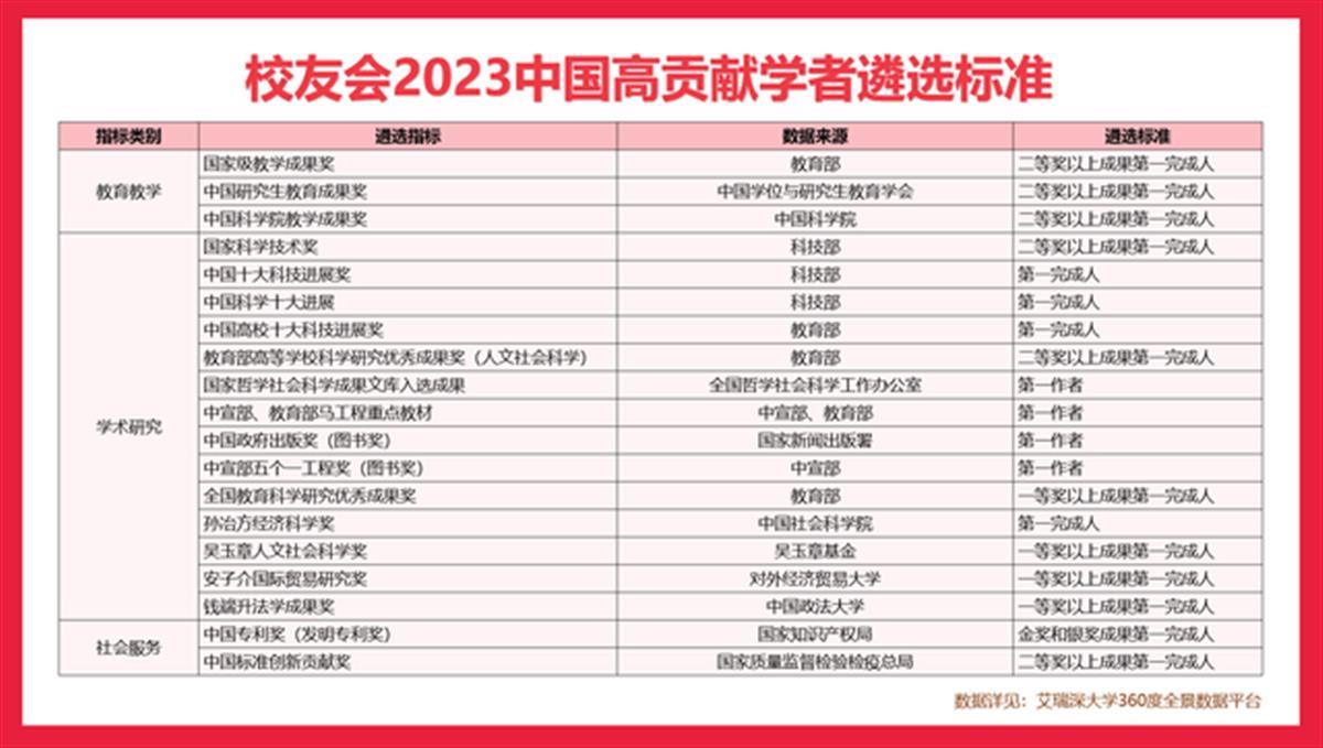 据悉,校友会2023中国高贡献学者评价遴选标准以中国学者对国家经济社会发展作出的系统性成就和贡献为基准,涵盖了国家级教学成果奖、国家科学技术奖励、教育部高等学校科学研究优秀成果奖(人文社会科学)、国家哲学社会科学成果文库、中宣部五个一工程奖、中国专利奖、全国教育科学研究优秀成果奖和孙冶方经济科学奖等19项公认的权威评价指标,从教育教学、学术研究和社会服务等多个角度科学系统全面评价高校优秀学者表现,遴选出中国高校的杰出学者,这是该榜单与中国高被引科学家、高被引学者仅从纯论文影响角度评价学者的最大不同。