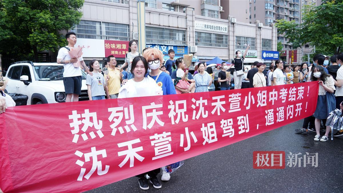 在武汉市洪山高中考点,一家长拉着横幅接考生出场