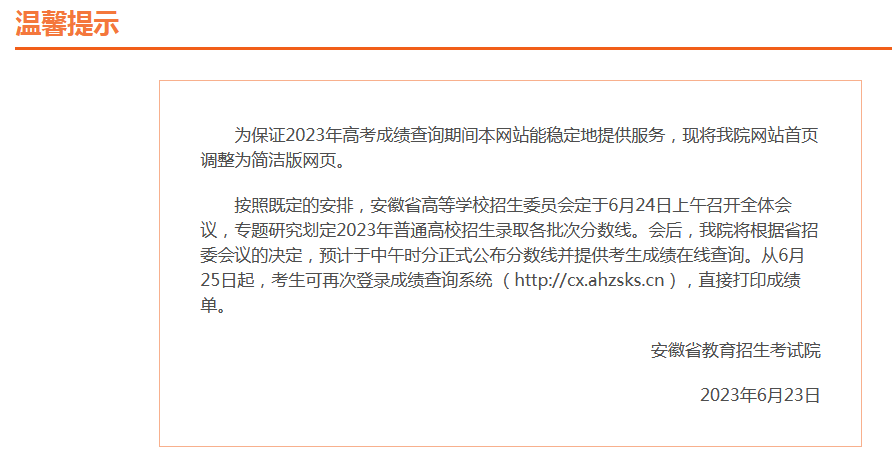 大皖新闻讯 2023年6月23日,安徽省教育招生考试院官网发布温馨提示,为保证2023年高考成绩查询期间本网站能稳定地提供服务,现将该院网站首页调整为简洁版网页。