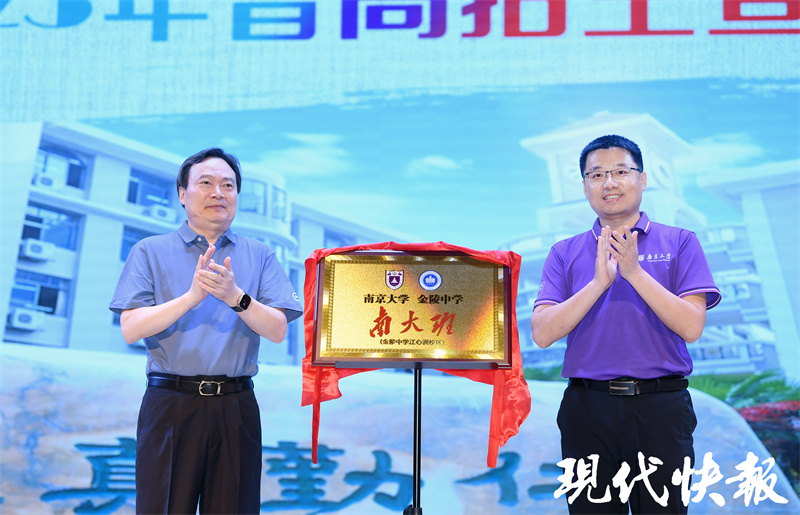现场,孙夕礼校长和南京大学本科生院副院长李浩,共同为江心洲校区“南大班”揭牌,两校一直紧密合作,近年来,更是开启“南南合作”,金陵中学的另一个校名就是南京大学金陵中学。