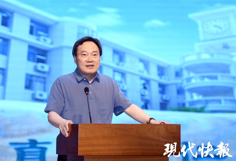 校园开放日活动现场,金陵中学校长孙夕礼致欢迎词。他介绍,江心洲校区和新街口校区是一样的,是校区不是分校。新街口校区和江心洲校区“新心相印”,课程、管理、评价、活动等都是一样的。
