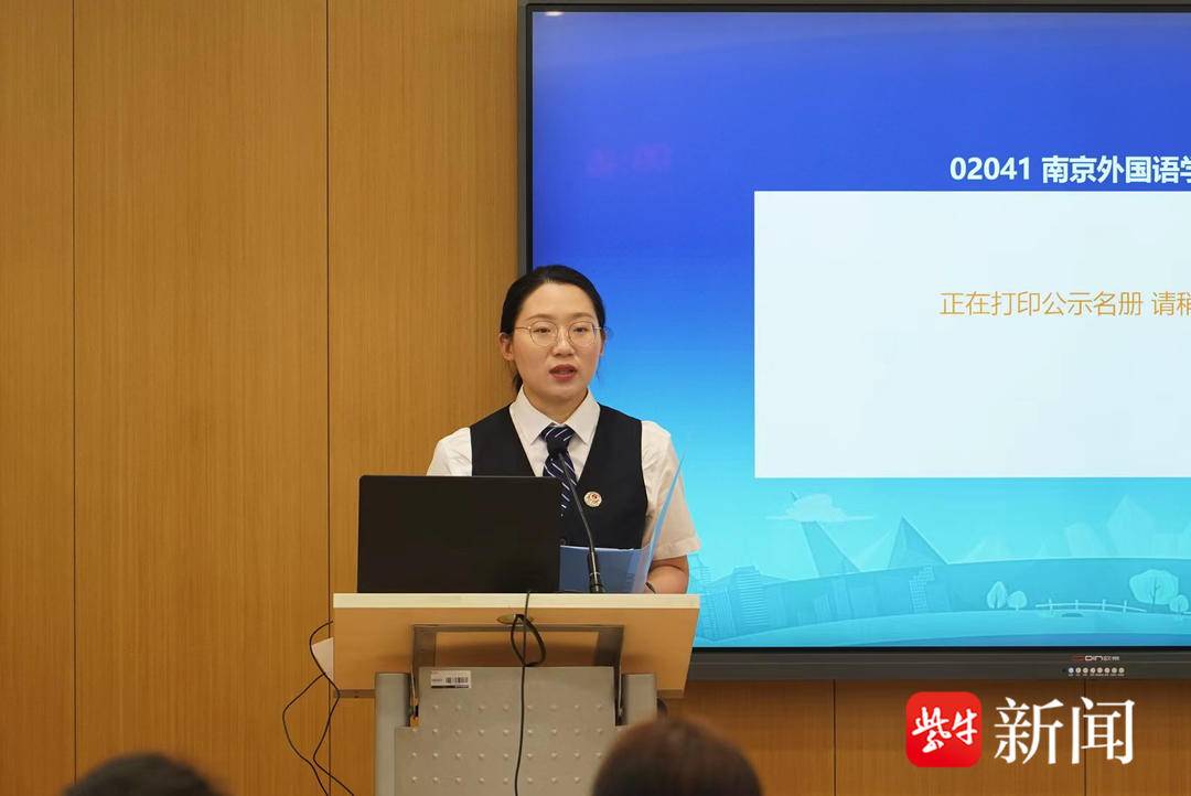在南外摇号现场,南外教学处副主任蒋兴超老师为各位讲解了派位流程。蒋老师介绍,今年有3881人报名参加南外摇号,经过电脑随机派位,确定3840个人选参加语言能力测试。特别说明,按照市教育局相关政策,今年有23对双胞胎报名并申请绑定南外电脑派位,因此最终派位生成的人数可能会增加,派位成功人数理论最大值为3863人。