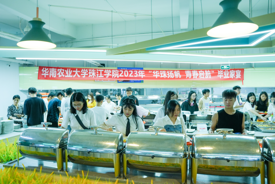 为使即将走出校园的华珠学子感受到母校的亲切关怀、不舍情谊和浓浓祝福,华珠毕业典礼当天在全校各食堂举办了一场主题为“华珠扬帆青春启航”的免费自助餐会,邀请全体2023届毕业生共赴家宴,品美食、叙友情、话离别、畅未来,让“欢送的筵席”成为大家美好的回忆。此刻的食堂与平时截然不同,热闹中透着温馨,喧嚣中含着感动。橱窗里一道道色味俱佳的菜肴,将初来大学的新鲜、学业有成的浓郁、挑战难关的爽辣融在一起,凝聚着食堂叔叔阿姨们的汗水,饱含着学校的关爱。
