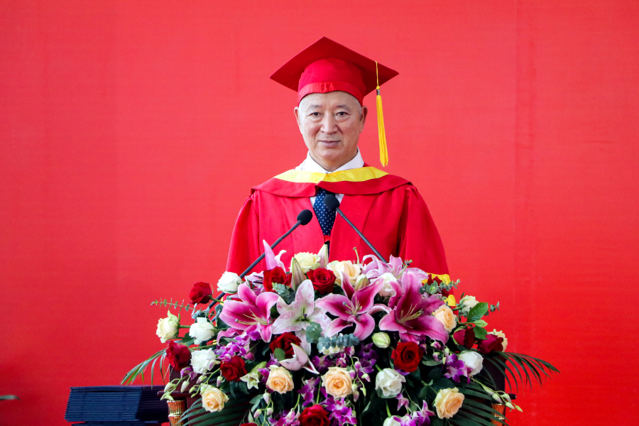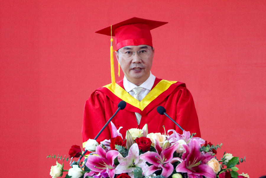 华南农业大学珠江学院校长蒋恩臣为毕业典礼致辞。他代表全校师生员工向出席典礼的校友代表及家长代表致以诚挚的欢迎,向辛勤的老师表达衷心的感谢,也向即将踏上新征程的同学们表示热烈祝贺。