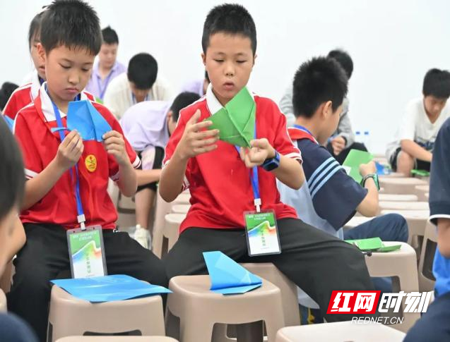 “纸飞机托起太空”比赛现场。赛场上,小选手们精心思考、巧妙设计,将一张张纸折叠成各式各样的纸飞机,摆好投掷姿势,放飞纸飞机的同时也放飞了心中的航天梦。