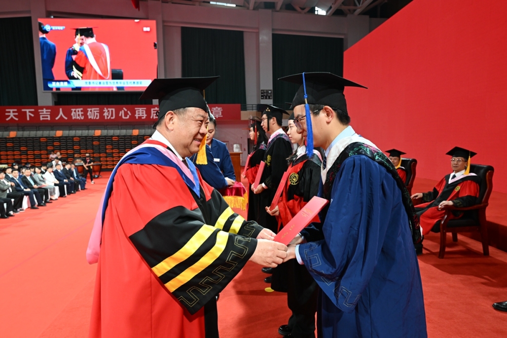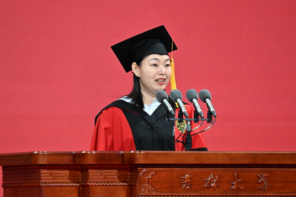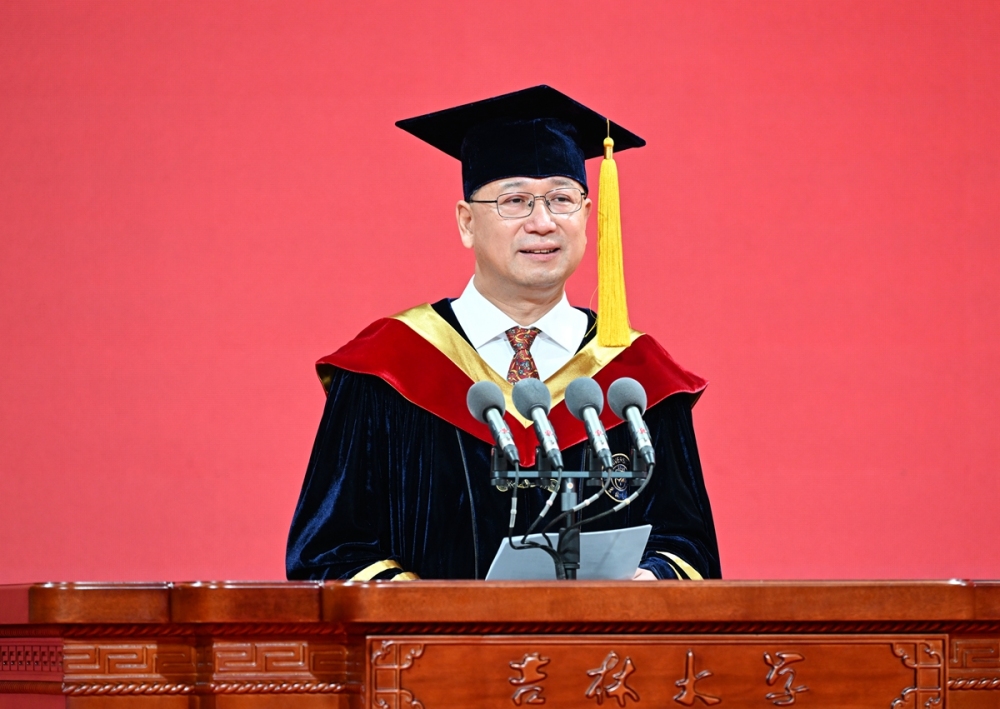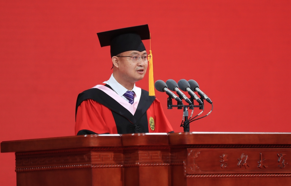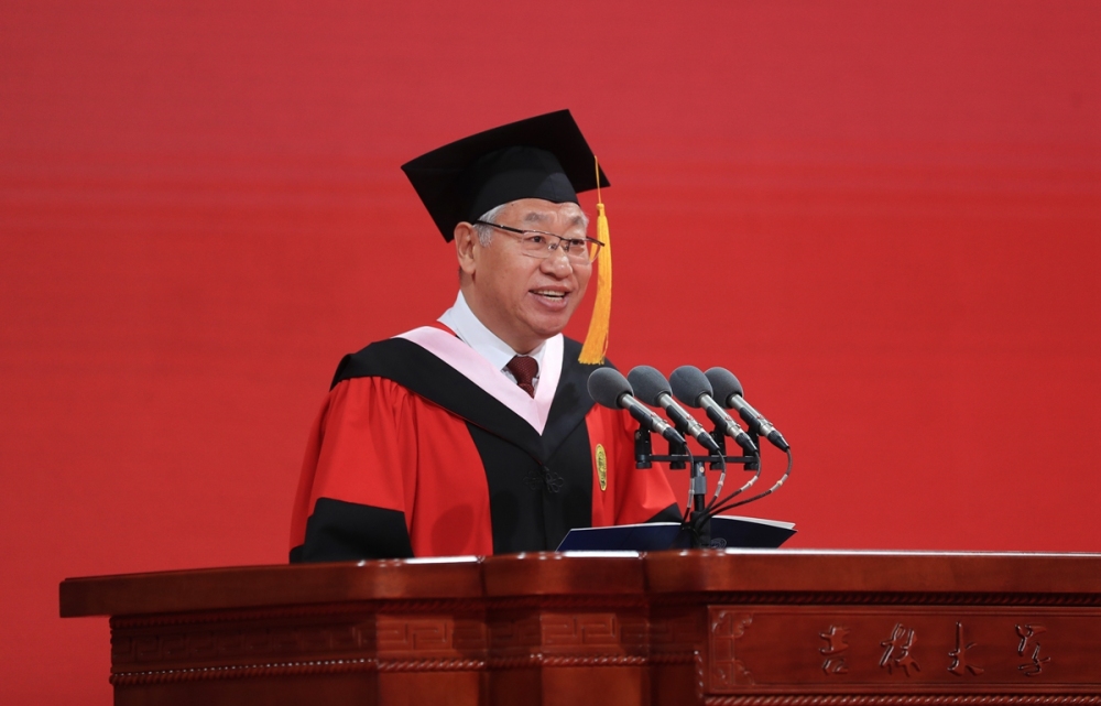 “吉大教会了我在这个纷乱的世界里从容淡定,在风起云涌中波澜不惊,让人的心静下来,踏踏实实做学问、做事情、做人,不追潮流、不慕虚荣,沿着自己选定的方向走。”1983届吉林大学电子科学系本科毕业生、中国工程院院士、清华大学教授周济作为校友代表致辞。他深情回忆了45年前在母校求学的难忘瞬间,告诉即将走向新征程的同学们,科研的价值不在于产出,而在于开拓和创新,人生是一场不期而遇的旅程,前路无法设计,未来难以预测,唯有学会独立思考,才能够更好地掌控自己的方向,打造属于自己的璀璨人生。