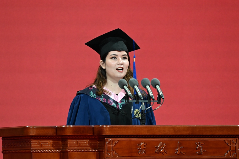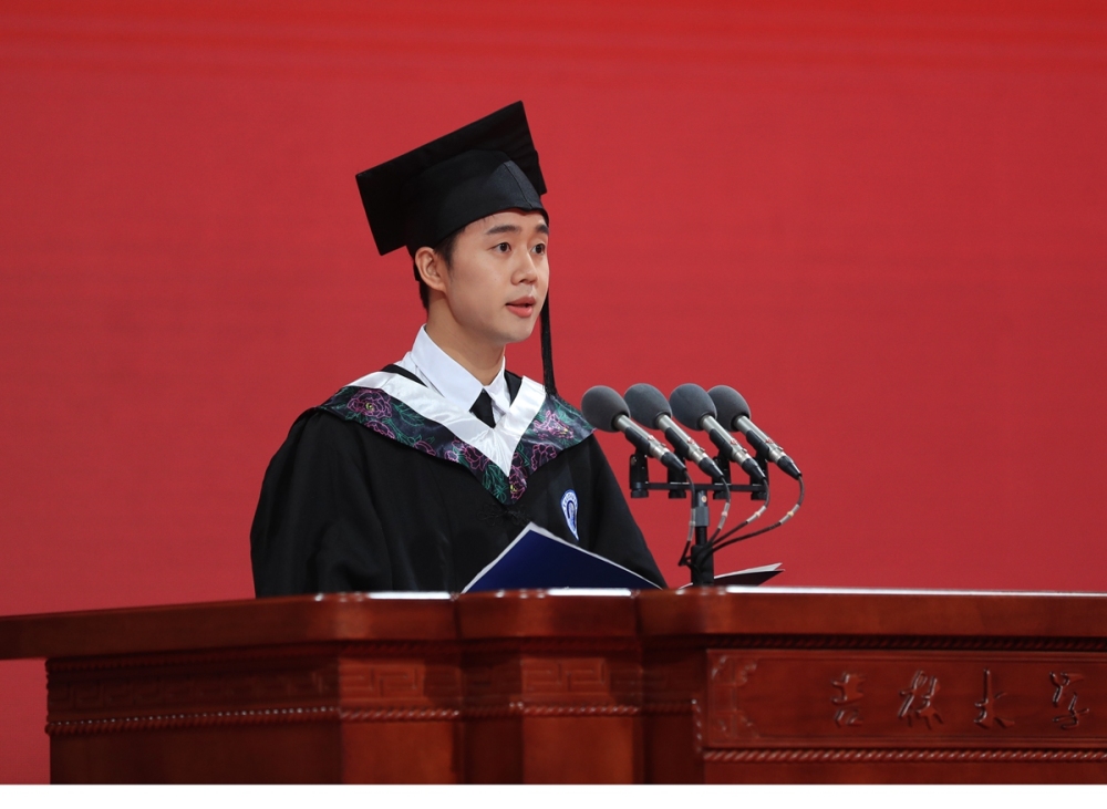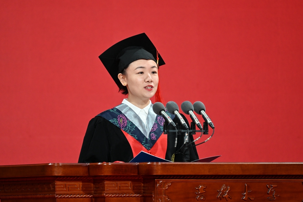 用脚步丈量祖国大地,用激情回应时代脉搏。本科毕业生代表雷双银,研究生毕业生代表隋宁,国际学生毕业生代表、来自土库曼斯坦的胡天美先后发言,他们回忆难忘的大学时光,畅谈求学的感悟体会,表达了对母校的深深热爱、感激与不舍。第十八届中国青年女科学家获得者鄢俊敏教授作为教师代表发言,希望同学们不忘初心、坚守梦想,知行合一、终身学习,胸怀天下,至诚报国,不断磨练意志品质,常怀感恩之心。