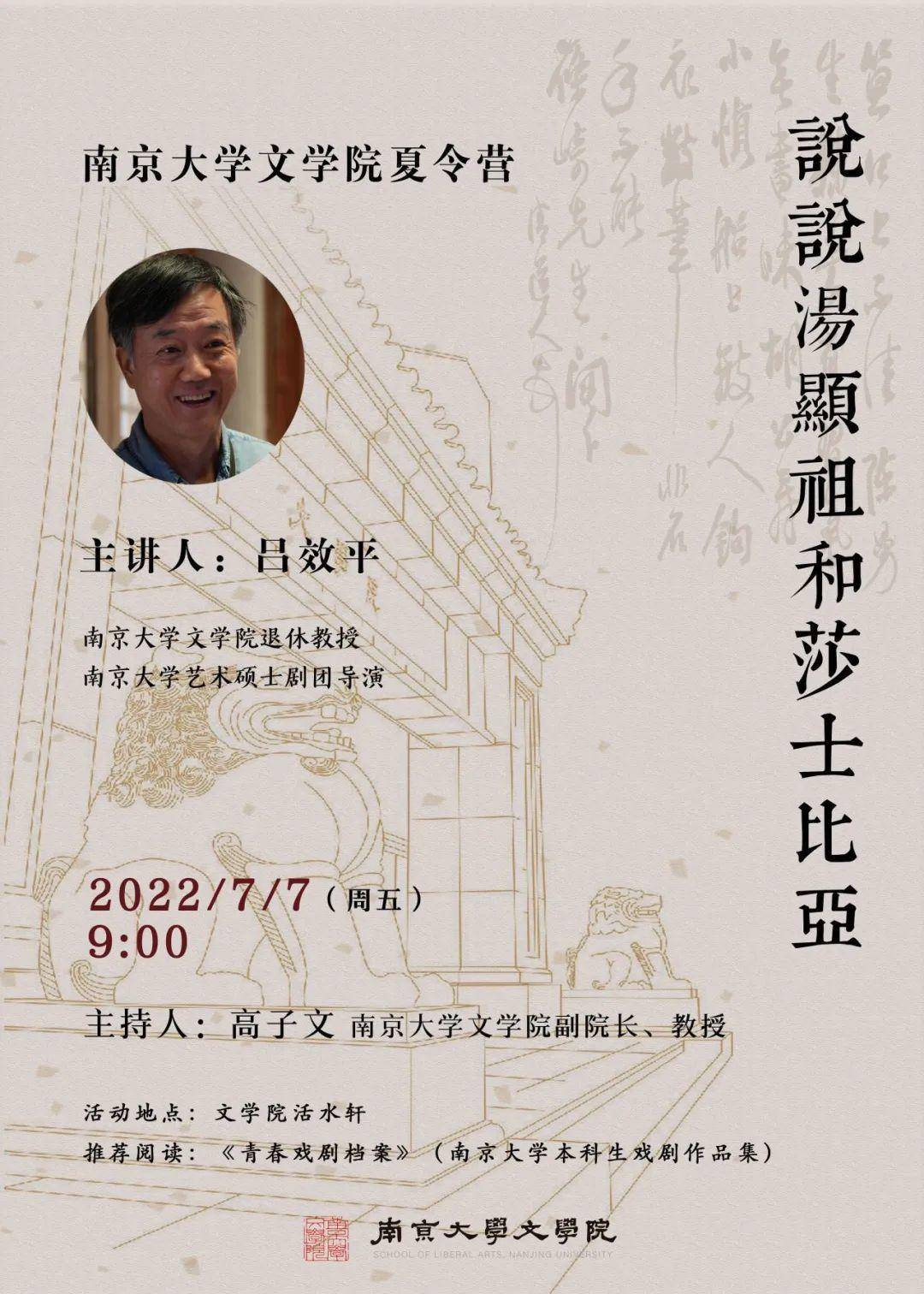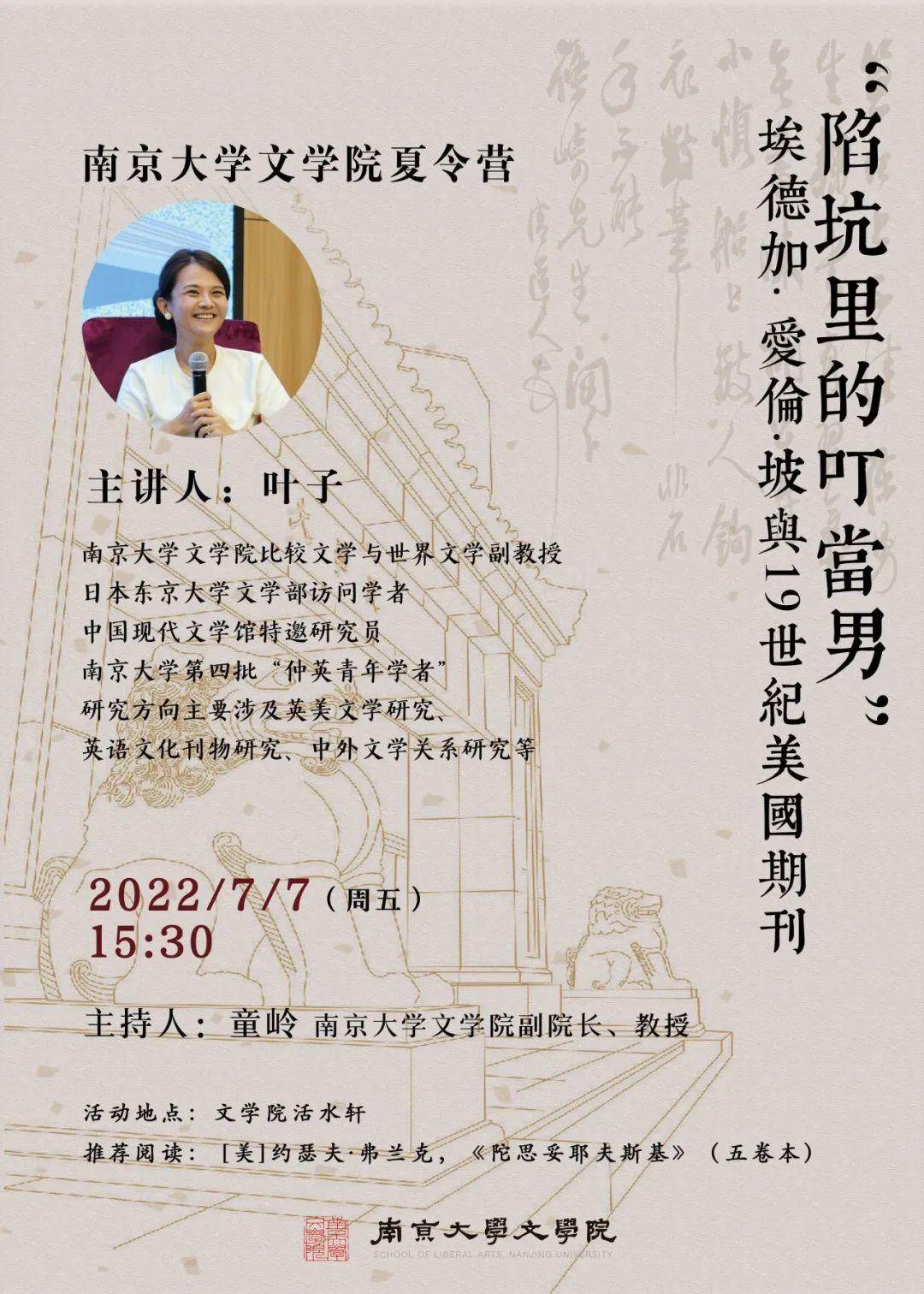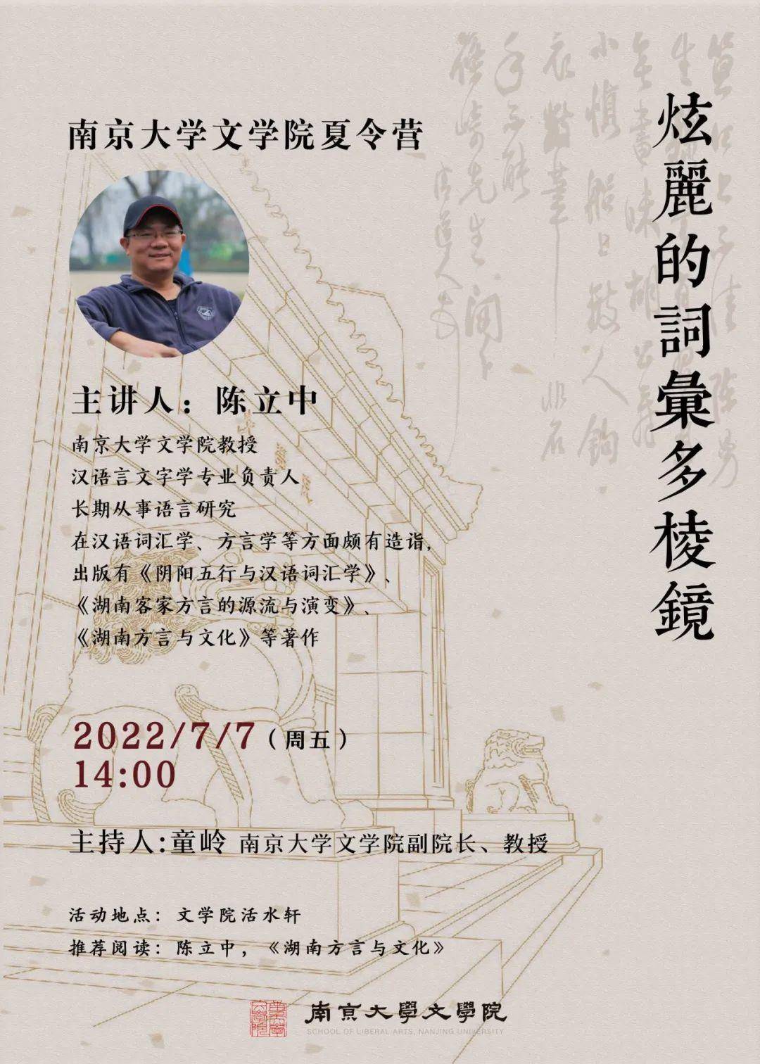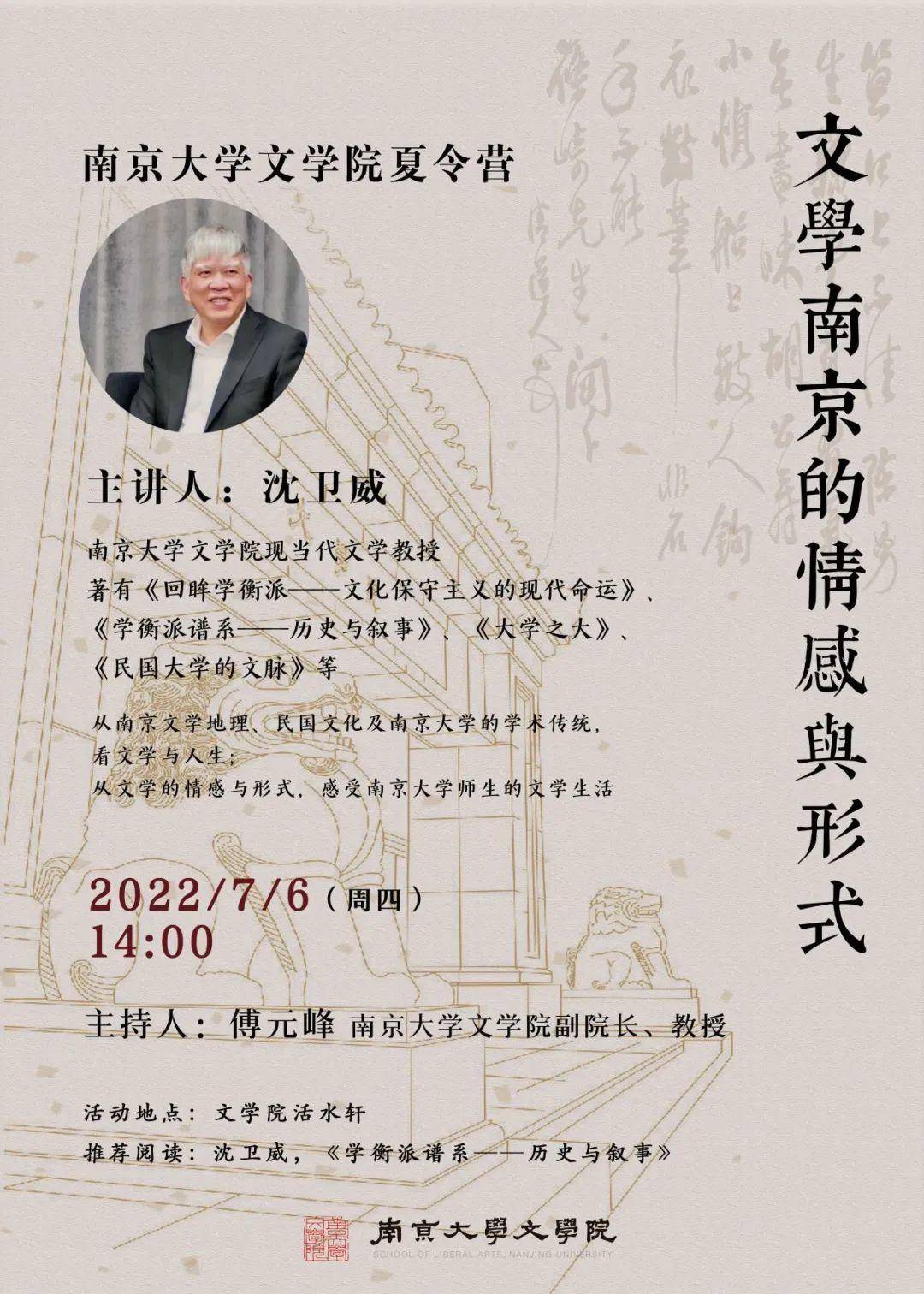 7月6日下午由南京大学中文系教授沈卫威讲授第二课《文学南京的情感与形式》,讲座将从南京的文学地理、民国文化及南京大学的学术传统,看文学与人生;从文学的情感与形式,感受南京大学师生的文学生活。
