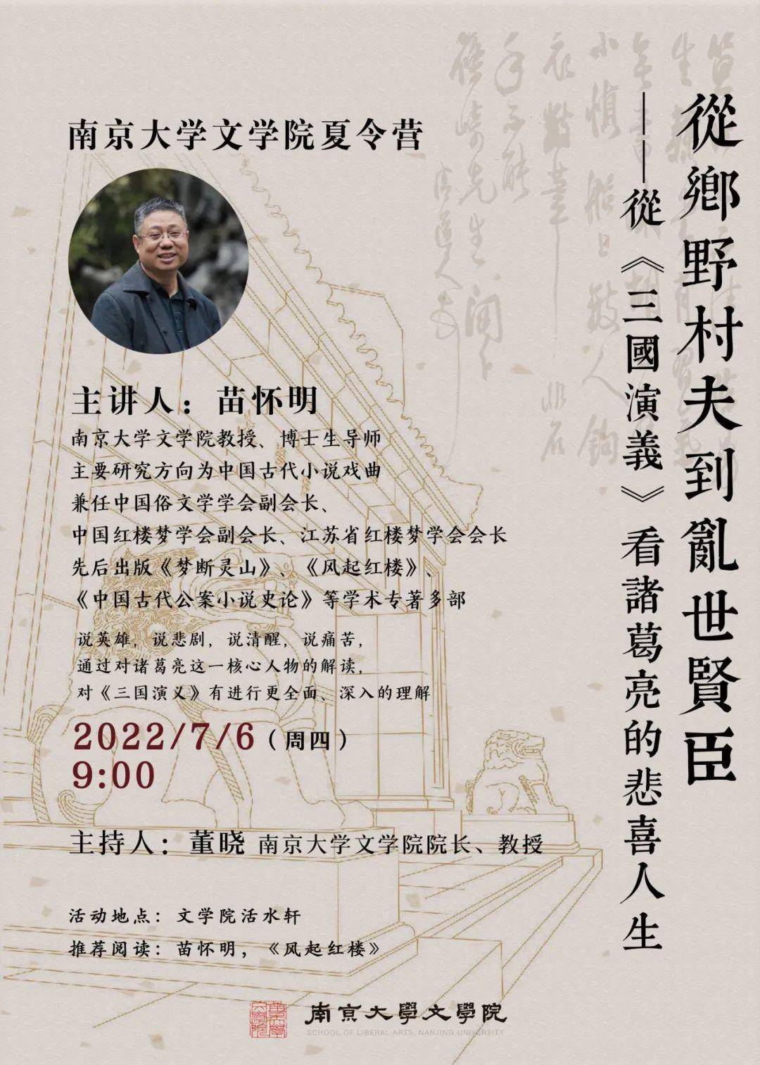 据悉,7月6日上午将举行夏令营开幕式,文学院党委书记倪蛟、文学院院长董晓、文学院副院长童岭将为开幕式致辞。南京大学文学院教授、博士生导师苗怀明将为同学们带来名师系列讲座的第一课,苗怀明主要研究方向为中国古代小说戏曲,兼任中国俗文学学会副会长、中国红楼梦学会副会长、江苏省红楼梦学会会长,他将以“从乡野村夫到乱世贤臣——从《三国演义》看诸葛亮的悲喜人生”为题,为同学们深入解读《三国演义》和诸葛亮这一核心人物。