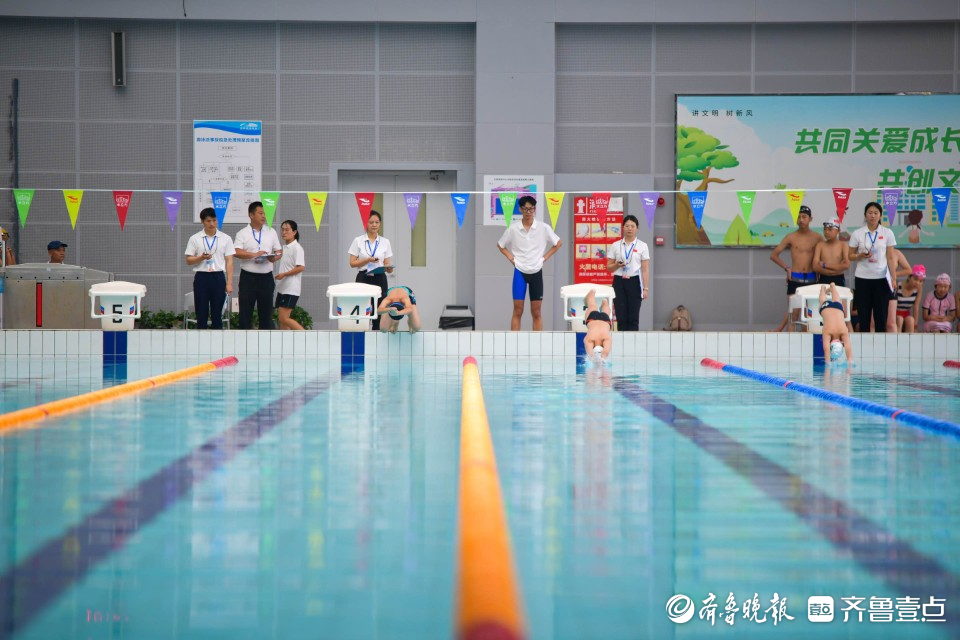 随着裁判员的一声令下,参赛小将从跳台跃入水中,劈波斩浪,奋力拼搏,50米长的泳池瞬时被激荡起无数浪花,只见小将们个个你追我赶、“泳”往直前,充分展现了永不放弃的良好精神风貌。现场呐喊声、欢呼声及掌声不断,赛场气氛高潮迭起。