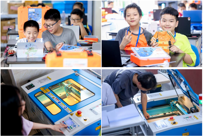 制作过程中,学生使用由DFRobot支持的Mind+、行空板、二哈识图等开源软硬件,完成了电脑编程、硬件搭建;在结构方面,使用了由雷宇支持的LaserMaker建模软件和激光切割机进行结构造型设计,在经过反复测试、迭代、打磨后,各组学生作品也逐渐成型。