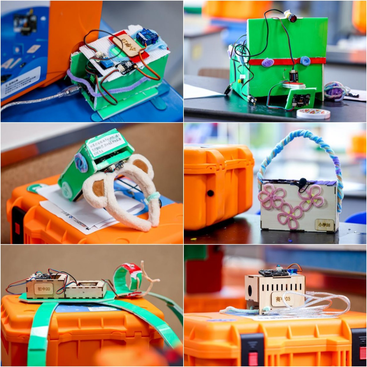 经过比赛第一天的努力奋战,参赛学生们现场一共创作出近150个“智能穿戴设备”作品,涉及了科技、艺术、生物、音乐、物理等多个学科领域;其中很多作品不仅结构精美,功能设计也贴近现实生活,极具创意性和实用性。
