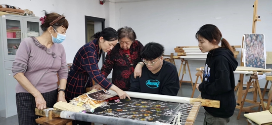 刘兆坤在老师的指导下绣织毕业作品。受访者供图